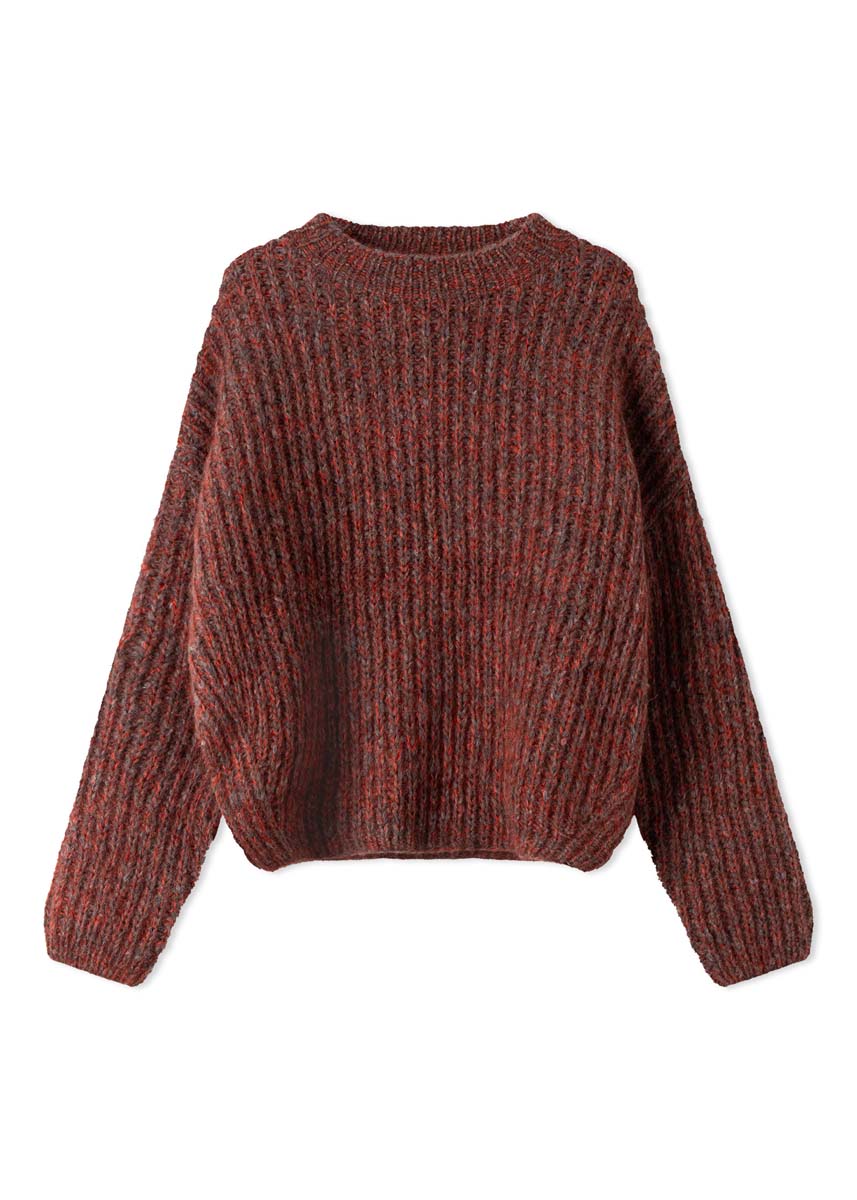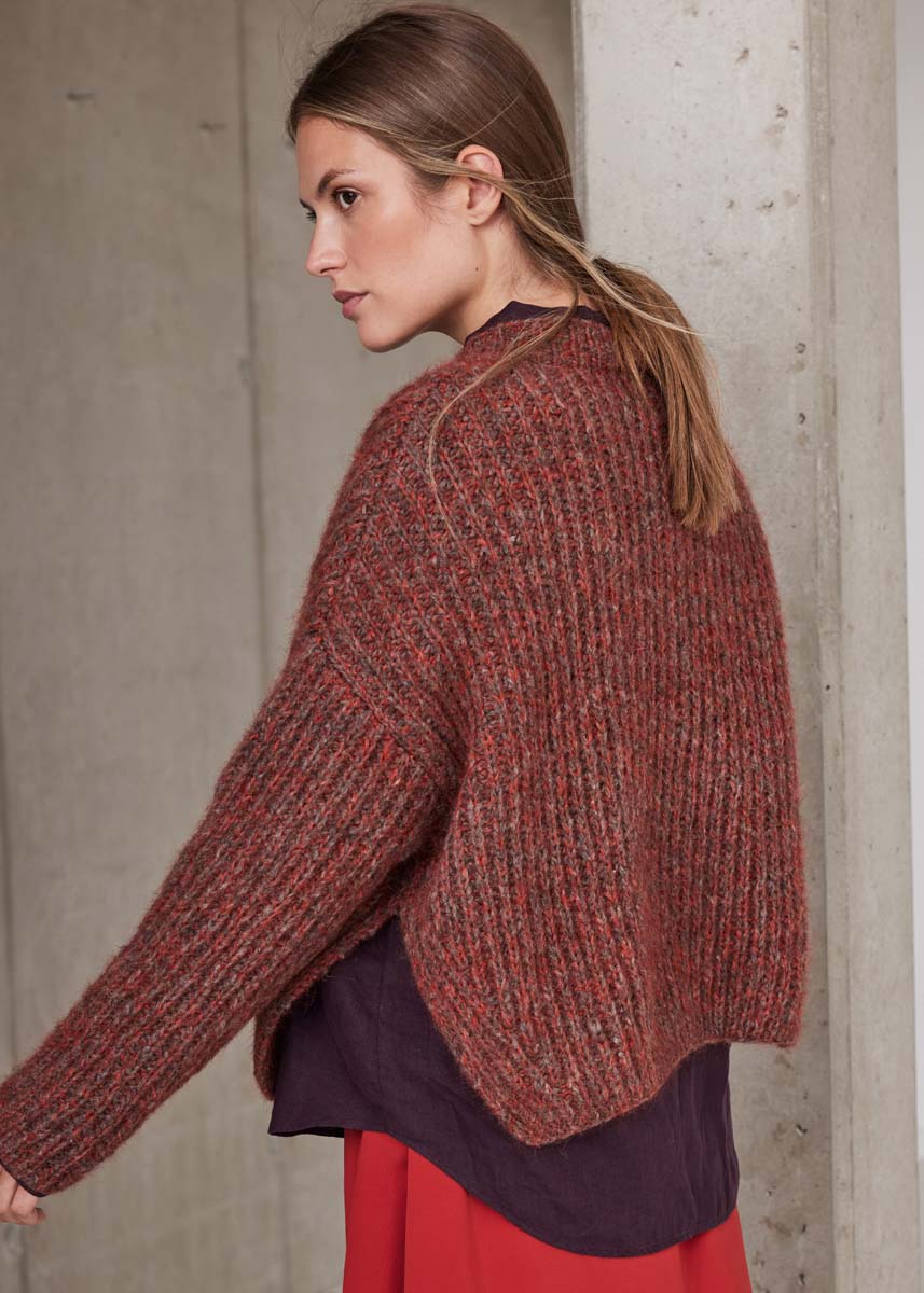 Lana Grossa Alpaca Air II (50% alpakka (baby), 27% polyamid,14% bomull, 9% ny ull (merino), løpelengde 140 m/50 g), 300 (300 - 350) g i gråbrun (farge 32) og Lana Grossa Silkhair (70% mohair (superkid), 30% silke, løpelengde 210 m/25 g), 125 (125 - 150) g i refleksrød (farge 215); strikkepinner nr. 4,5; 1 rundpinne nr. 4,5, 50 cm lang.