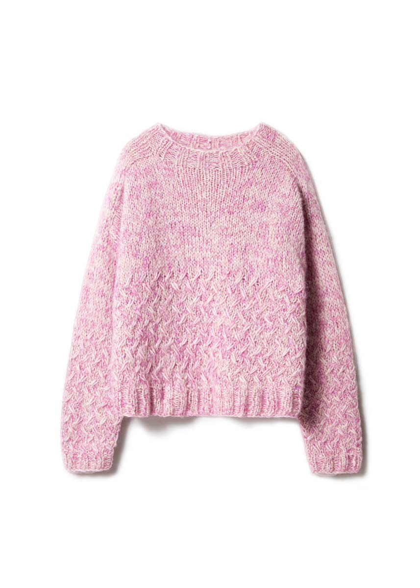 Lana Grossa-kvalitet „Alpaca Air” (62 % (baby) alpacka, 27 % polyamid, 11 % ren ny ull (fin merino), löplängd = ca. 140 m/50 g): ca. 250 (300) g beige (färg 2) och Lana Grossa-kvalitet „Silkhair” (70 % mohair (superkid), 30 % silke, löplängd = ca. 210 m/25 g): ca. 100 (125) g purpurröd (färg 197); stickor nr. 7, 1 rundsticka nr. 7, 50 cm lång.