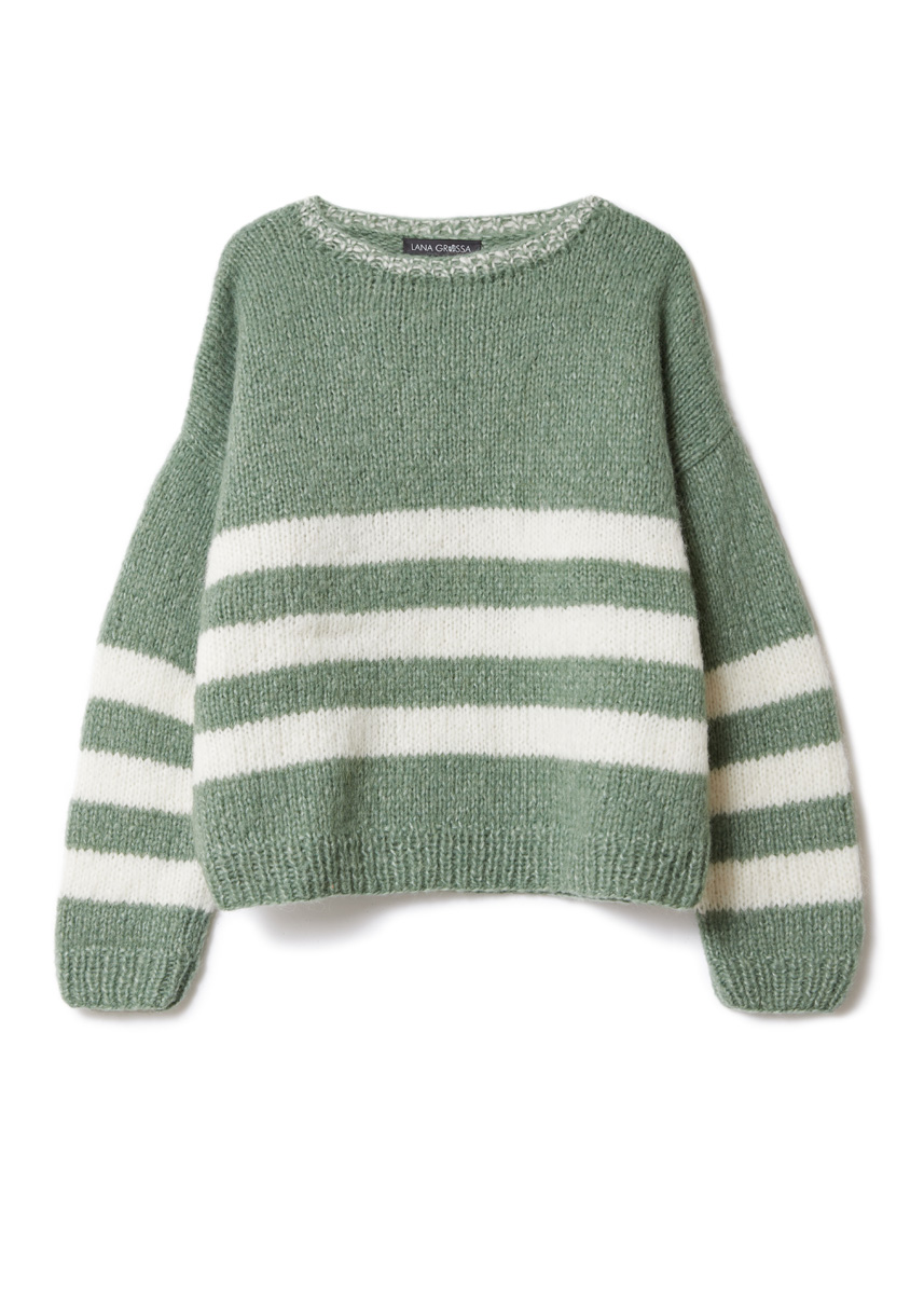 Lana Grossa „Alpaca Air“ (62% alpacka (baby), 27% polyamid, 11% ren ny ull (merino fine), löplängd 140 m/50 g), 200 (250 – 300) g grågrön (färg 14) och 100 (150 -150) g råvit (färg 1); stickor nr. 6 och 1 rundsticka nr. 5,5, 40 cm lång.