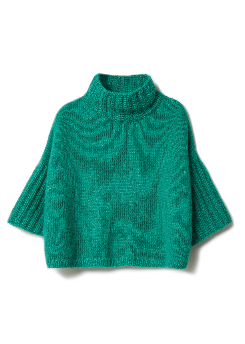 Lana Grossa-kvalitet „alpacka Air“ (62 % alpacka (baby), 27 % polyamid, 11 % ren ny ull (merino Fine), löplängd = ca 140 m/50 g): ca 250 (300 - 300 - 350) g Jadegrön (färg 24); stickor nr. 5; 1 kort rundsticka nr. 5.