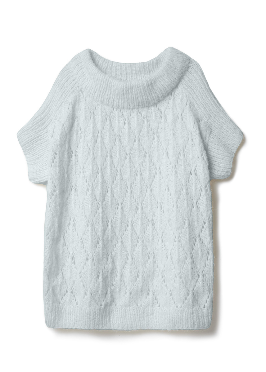 Lana Grossa-kvalitet „alpacka Air“ (62 % alpacka (baby), 27 % polyamid, 11 % ren ny ull (merino Fine), löplängd = ca 140 m/50 g): ca 300 (300 - 350 - 350) g pastellblå (färg 28); stickor nr. 4 och 4,5; 1 kort rundsticka nr. 4.