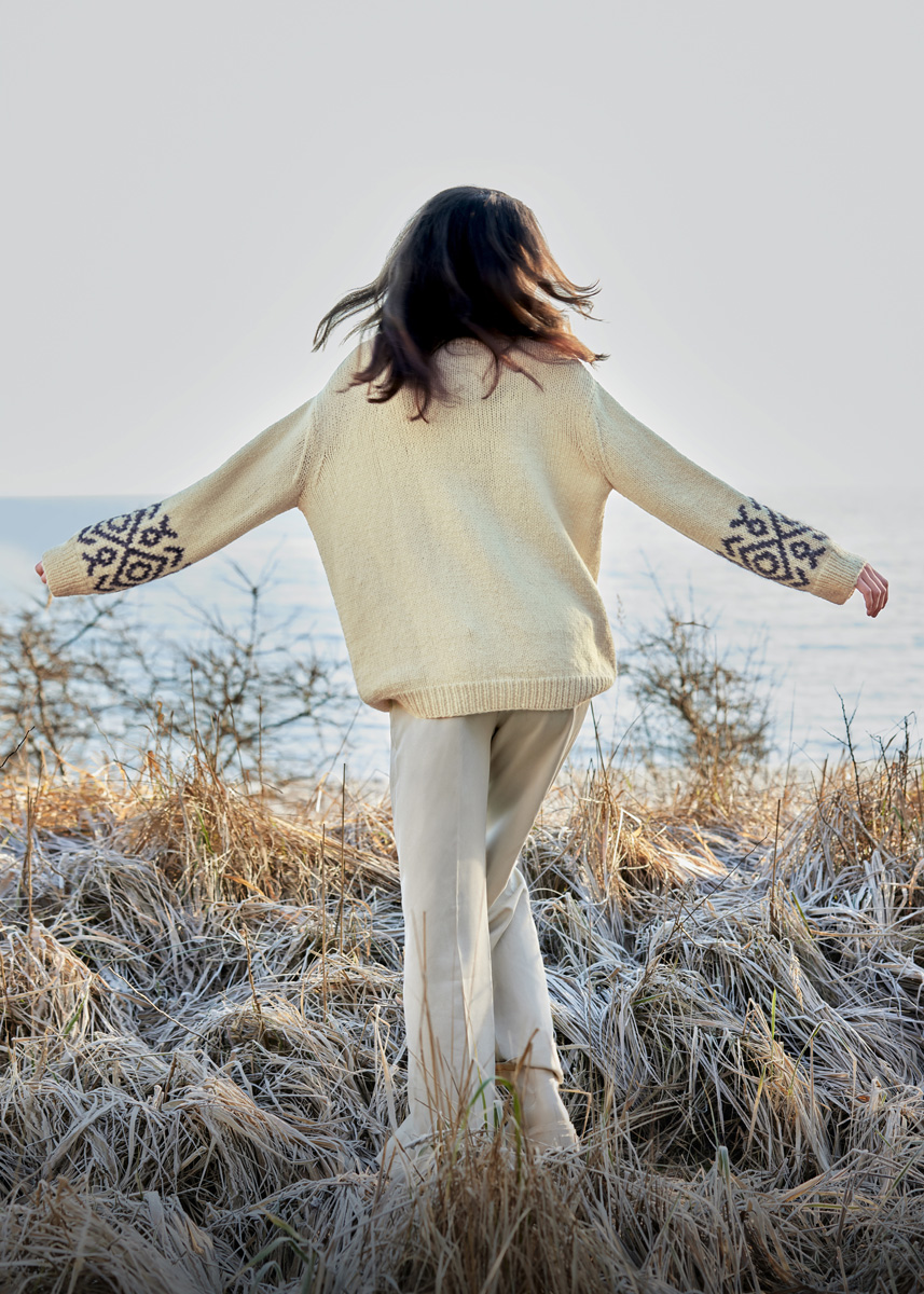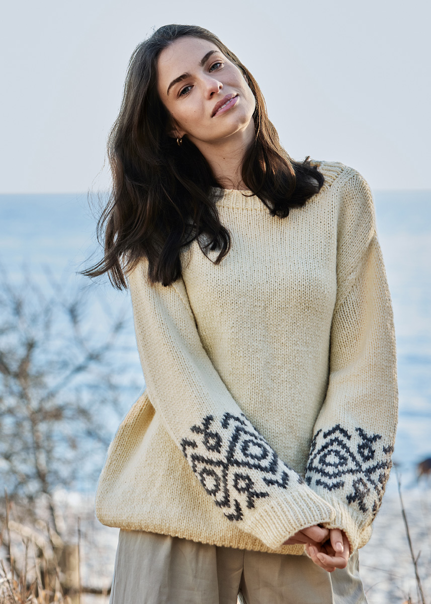 Lana Grossa-kvalitet „Alpaca Moda“ (74 % (baby) alpacka, 13 % ren ny ull (merino), 13 % polyamid, löplängd = ca 135 m/50 g): ca 50 (50 - 100 - 100) g anthracit (färg 5); och „Cool Merino Big“ (90 % ren ny ull (merino), 10 % polyamid, löplängd = ca 90 m/50 g): ca 550 (600 - 600 - 650) g råvit (färg 201); stickor nr. 5 och 7, 1 kort rundsticka nr. 5