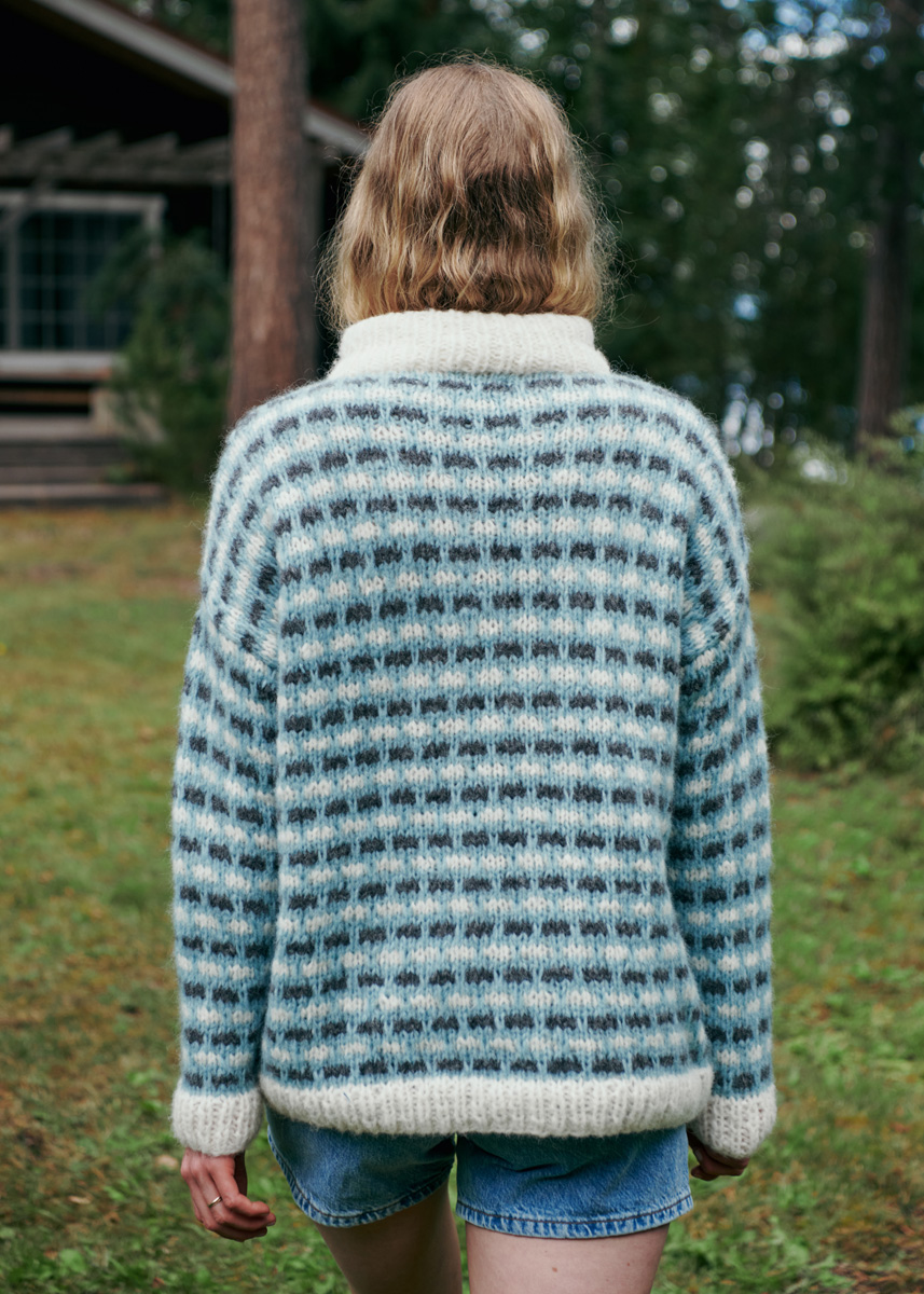 Lana Grossa-kvalitet „Alpaca Moda“ (74 % (baby) alpacka, 13 % ren ny ull (merino), 13 % polyamid, löplängd 135 m/50 g): ca. 200 g isblå (färg 7), ca. 150 g vit (färg 1) och ca. 100 g antracit (färg 5); stickor nr. 6 och 7, 1 rundsticka nr. 6, 50 cm lång.