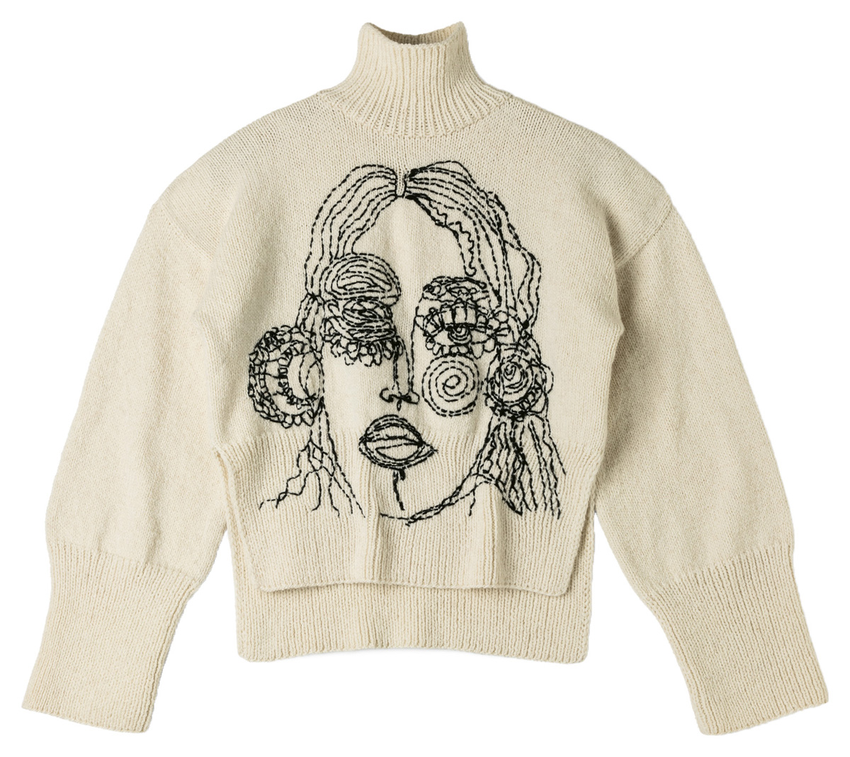 Lana Grossa Alta moda Alpaca (90% alpacka (baby), 5% ren ny ull (merino), 5% polyamid, löplängd 140 m/50 g), 650 (700 – 750) g råvit (färg 14) och Lana Grossa Cashmere 16 Fine (80% ren ny ull (merino), 10% kashmir, 10% polyamid, löplängd 320 m/50 g), 50 g svart (färg 18); stickor nr. 5 och 5,5, samt 1 rundsticka nr. 5, 40 cm lång, 1 ullnål.