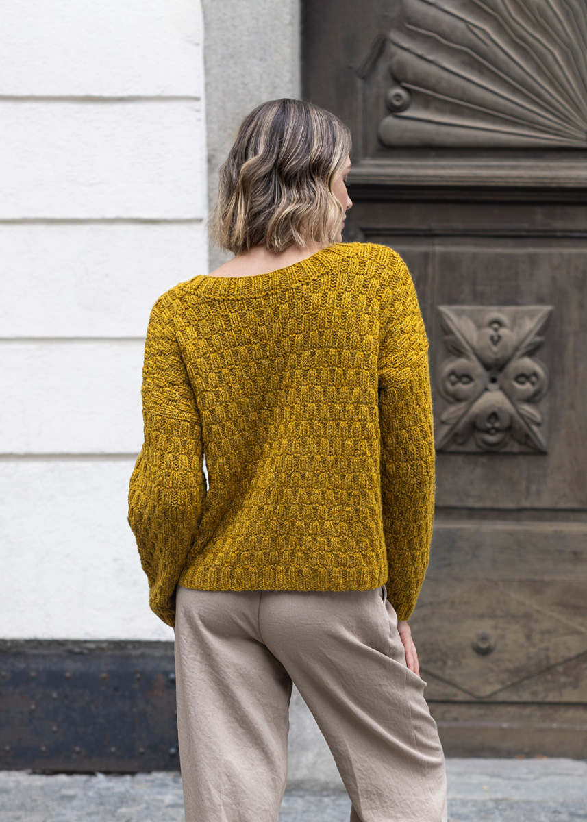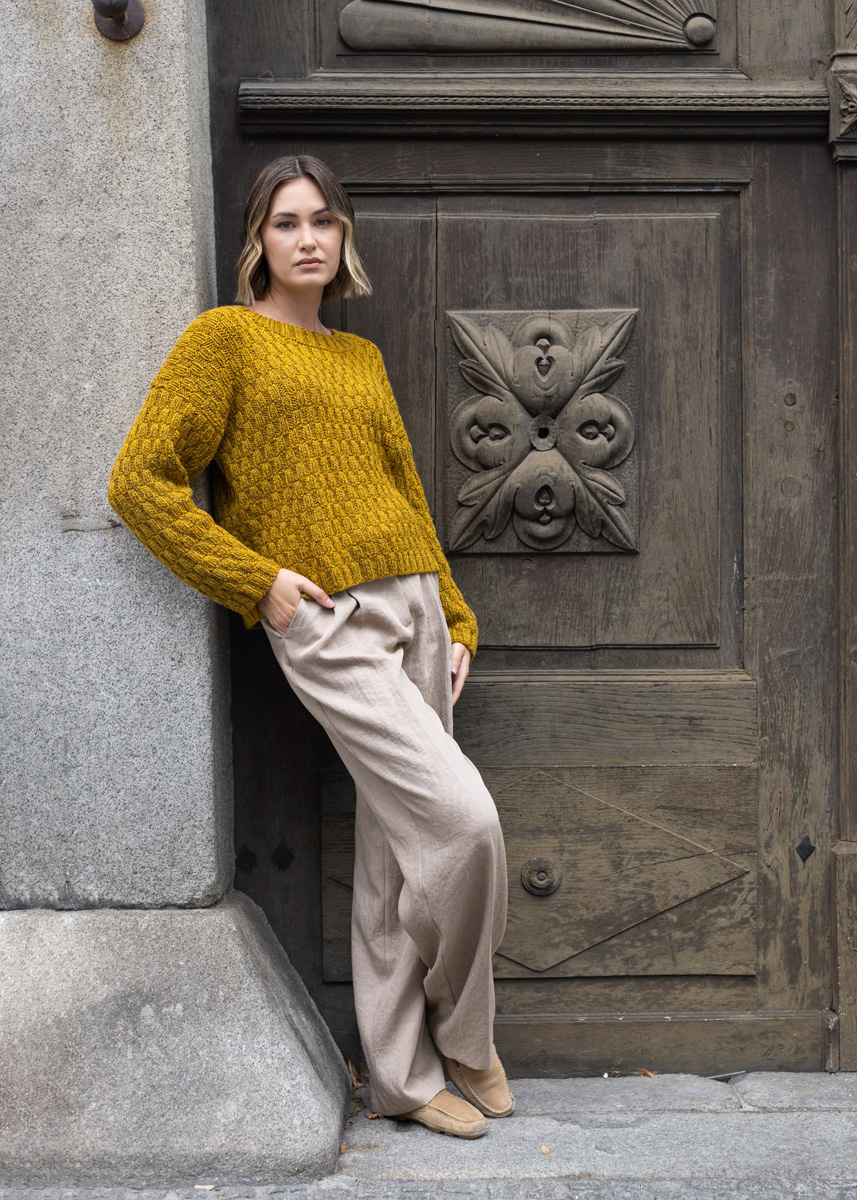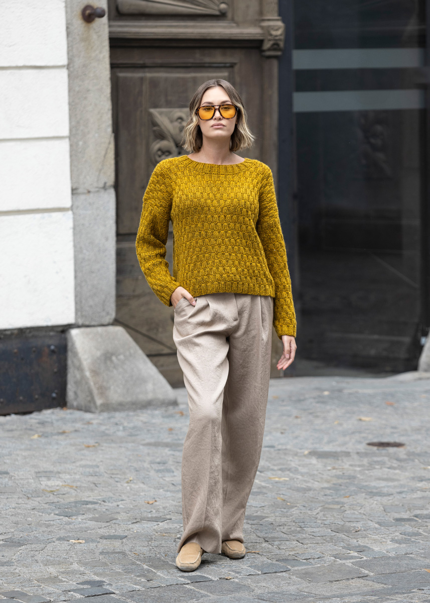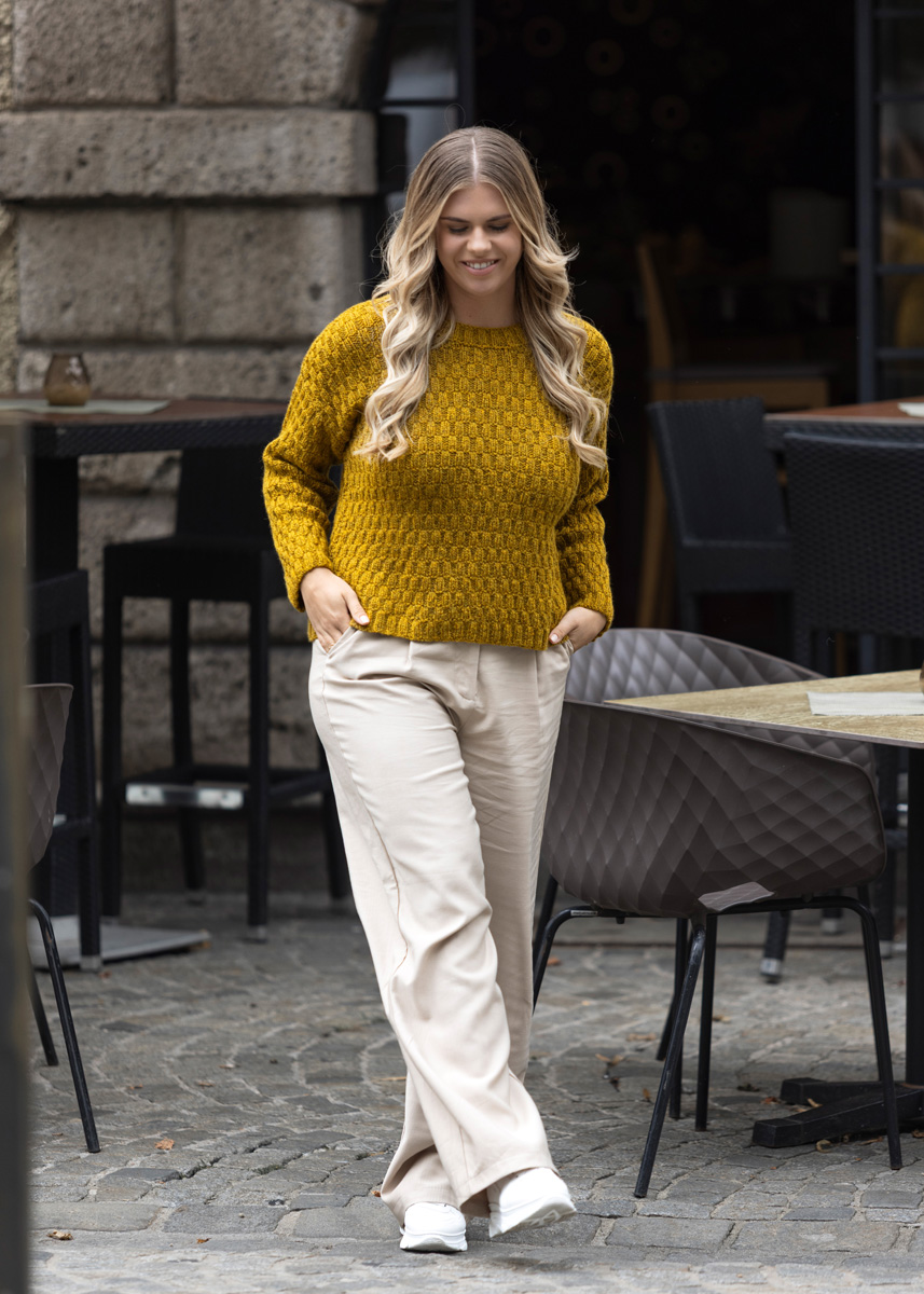 Lana Grossa ALTA MODA ALPACA 90 % alpacka, 5% polyamid, 5% ren ny ull Löplängd: ca. 140 m / 50 g • 400 (450 - 500 - 550 - 600 - 650) g senapsgul (färg 96)