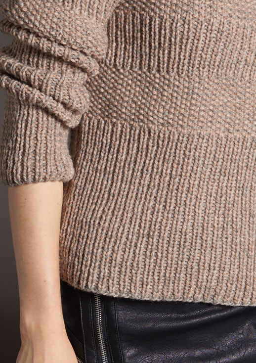 Lana Grossa-kvalitet „Alta Moda Alpaca“ (90 % (baby) alpaka, 5 % ren ny uld (merino), 5 % polyamid, løbelængde = ca. 140 m / 50 gr.): ca. 250(300) gr. grå/beige meleret (fv. 15) og fersken (fv. 46), rundpind nr. 6½ og 7, 80 cm, rundpind nr. 6, 60 cm.