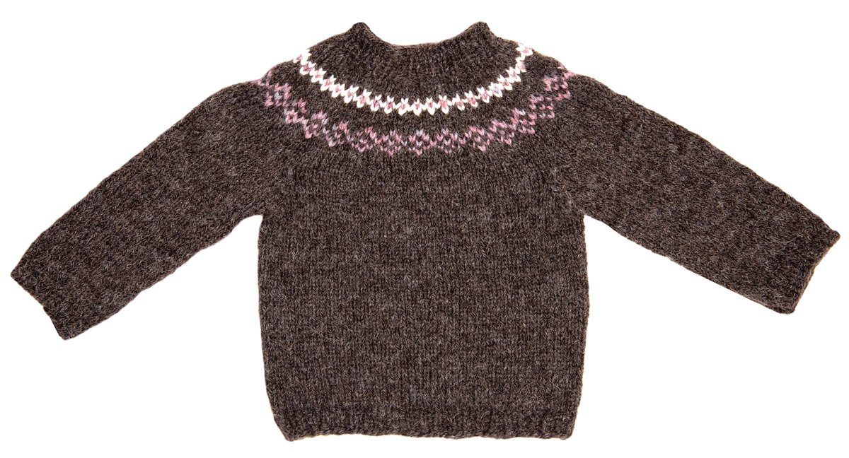 Lana Grossa-kvalitet ”Alta Moda Alpaca” (90 % (baby) alpaka, 5 % ren ny uld (merino), 5 % polyamid, løbelængde = ca. 140 m / 50 gr.): ca. 100(150- 150-200) gr mokka meleret (fv 10), 50 gr råhvid (fv 14) og 50 gr syren meleret (fv 44), strikkepinde nr. 4½, rundpind nr. 4½, 40 cm