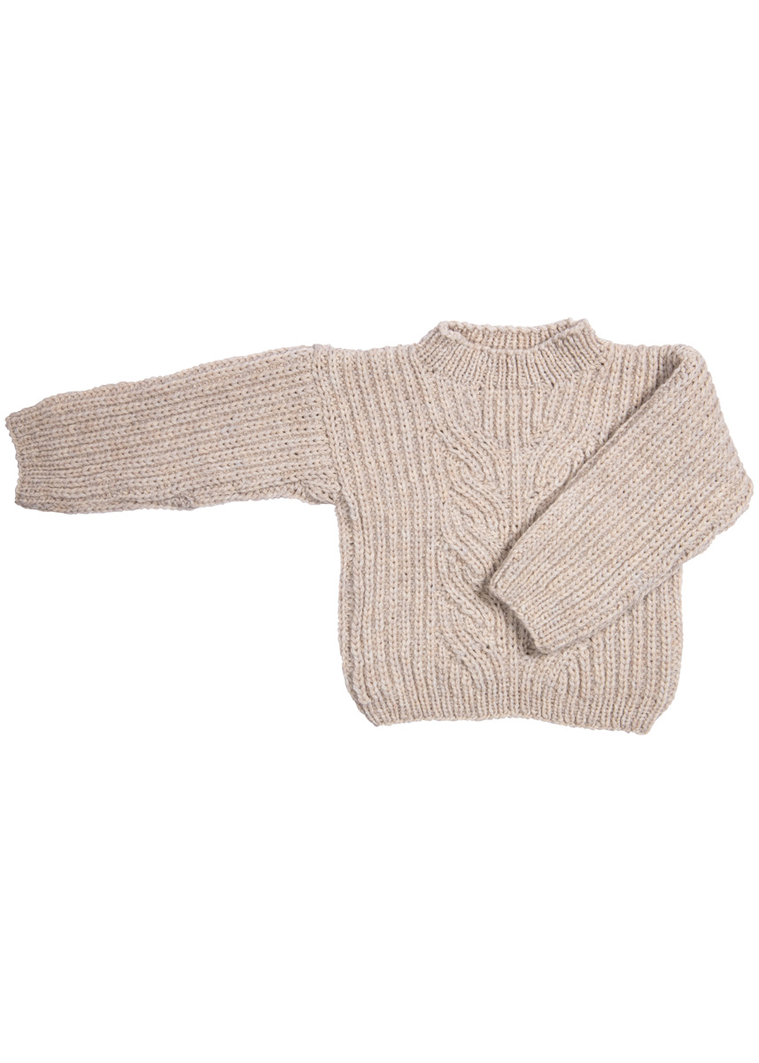 : Lana Grossa-kvalitet ”Alta Moda Alpaca” (90 % alpaka (baby), 5 % ren ny uld (merino), 5 % polyamid, løbelængde = ca. 140 m / 50 gr.): ca. 200(200-250-250) gr natur (fv 72), strikkepinde nr. 5, rundpind nr. 5, 40 cm. Bemærk: Ønsker du at strikke begge dele i sættet, skal du bruge i alt 250 gr garn (alle str.). Rib: Skiftevis 1 ret og 1 vrang.