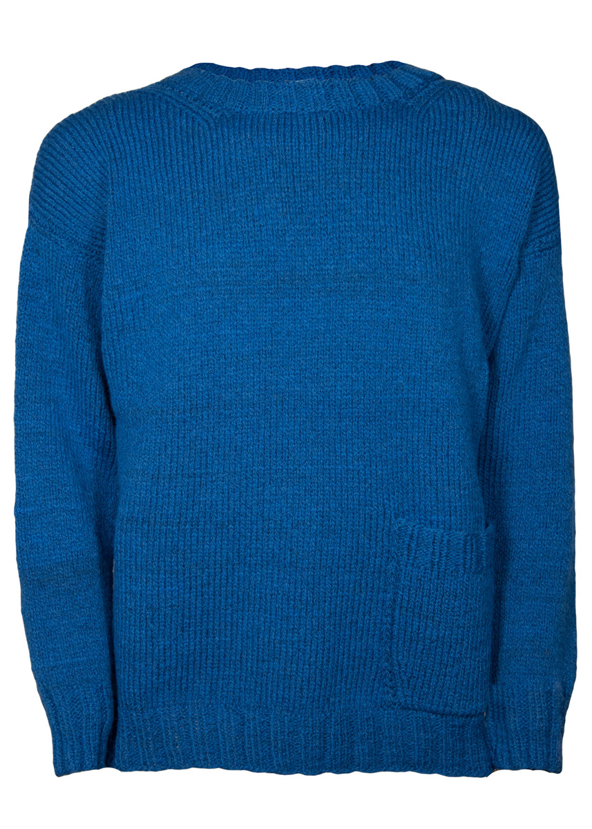 Lana Grossa Alta moda Alpaca (90% baby alpakka, 5% ren ny ull merino, 5% polyamid, løpelengde 140 m/50 g), 550 (600 – 650) g blå (farge 76); strikkepinner nr. 5 og 6, 1 rundpinne nr. 5, 40 cm lang.
