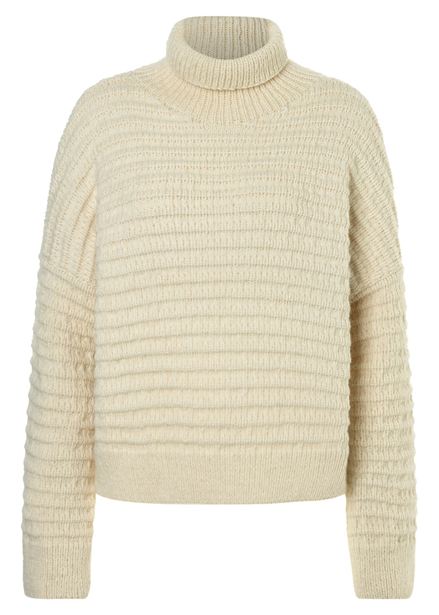 Lana Grossa-kvalitet „Alta Moda Alpaca” (90 % (baby) alpacka, 5 % ren ny ull (merino), 5 % polyamid, löplängd = ca. 140 m/50 g): ca. 750 (800 - 850) g råvit (färg 14); stickor nr. 4 och nr. 5, 1 rundsticka nr. 4, 40 cm lång.