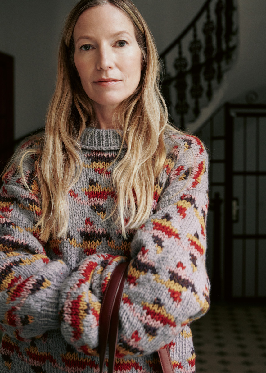Lana Grossa Alta Moda Cashmere 16 (78% ren ny ull (merino), 12% kashmir, 10% polyamid, löplängd 110 m/50 g), 400 (450 – 500) g mauve (färg 61) och Lana Grossa Country Tweed (100% ren ny ull, löplängd 90 m/50 g), 100 g guldbrun melerad (färg 8), 100 g mokka melerad (färg 10), 100 g gammelrosa melerad (färg 12) och 100 g röd melerad (färg 11); stickor nr. 7 och 8, 1 rundsticka nr. 7, 40 cm lång.