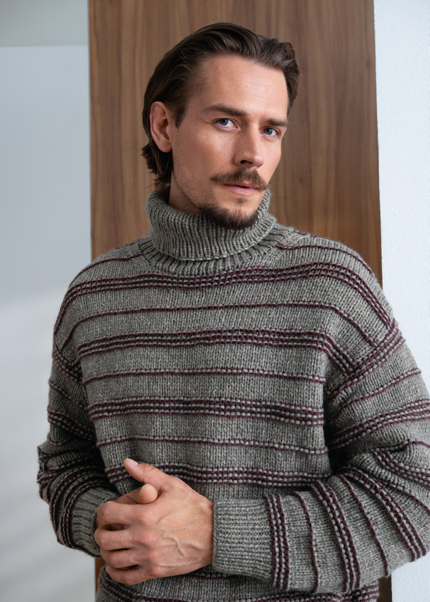 Lana Grossa Alta Moda Cashmere 16 (78% ren ny ull (merino ), 12% kasjmir, 10% polyamid, løpelengde 110 m/50 g), 550 (600 – 650) g taupe (farge 3) og 150 g burgunder (farge 27); 1 rundpinne nr. 6 og 8, 60 cm lang og 1 rundpinne nr. 7, 40 cm lang.