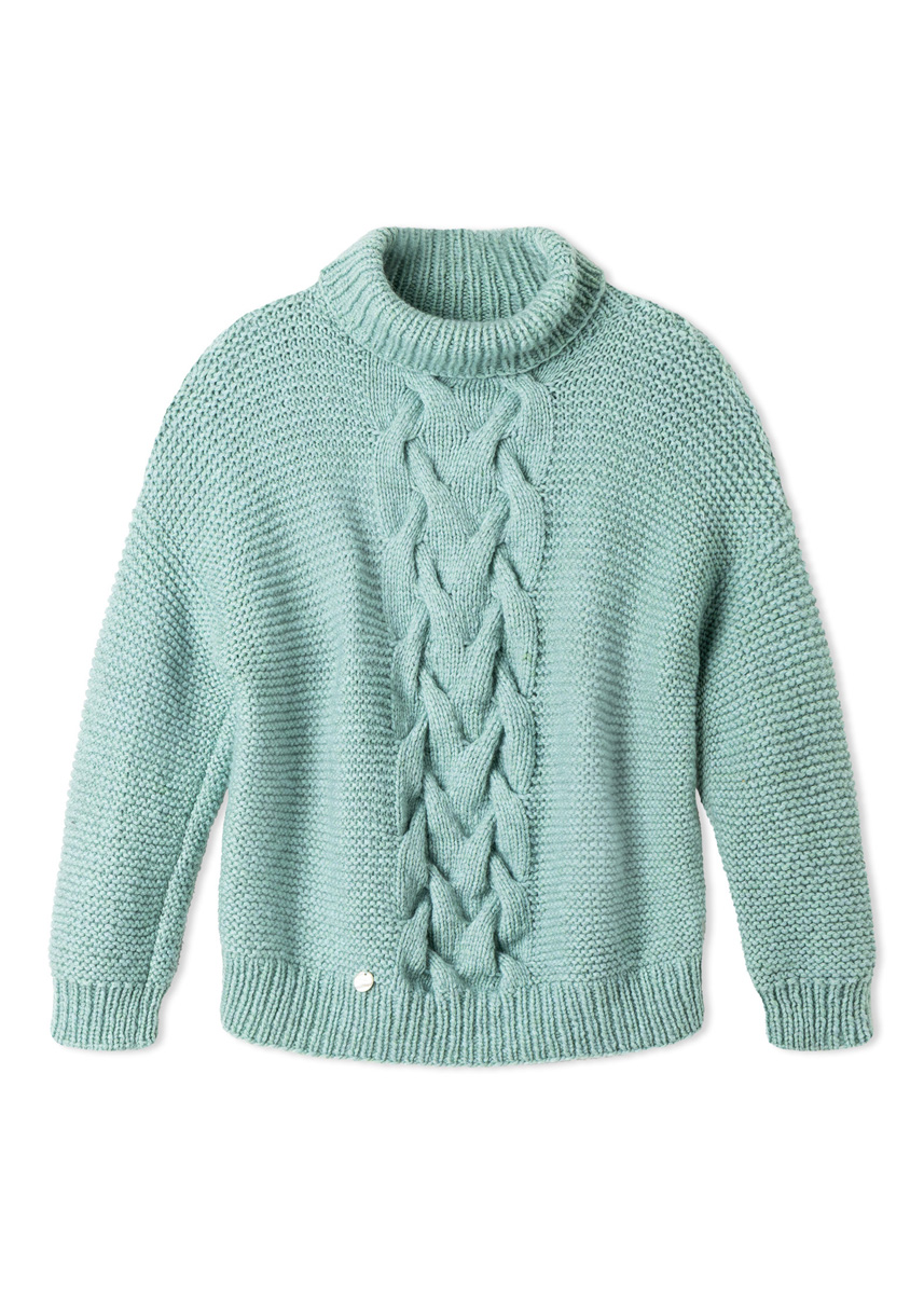 Lana Grossa „Alta Moda Cashmere 16” (78 % ren ny ull (merino), 12 % kasjmir, 10 % polyamid, løpelengde = ca. 110 m/50 g): ca. 550 (600 – 650) g minttyrkis (farge 34); strikkepinner nr. 7 og 8, 1 rundpinne nr. 7, 50 cm lang.