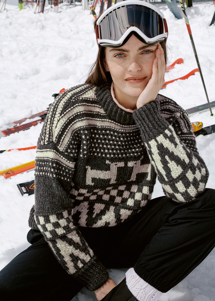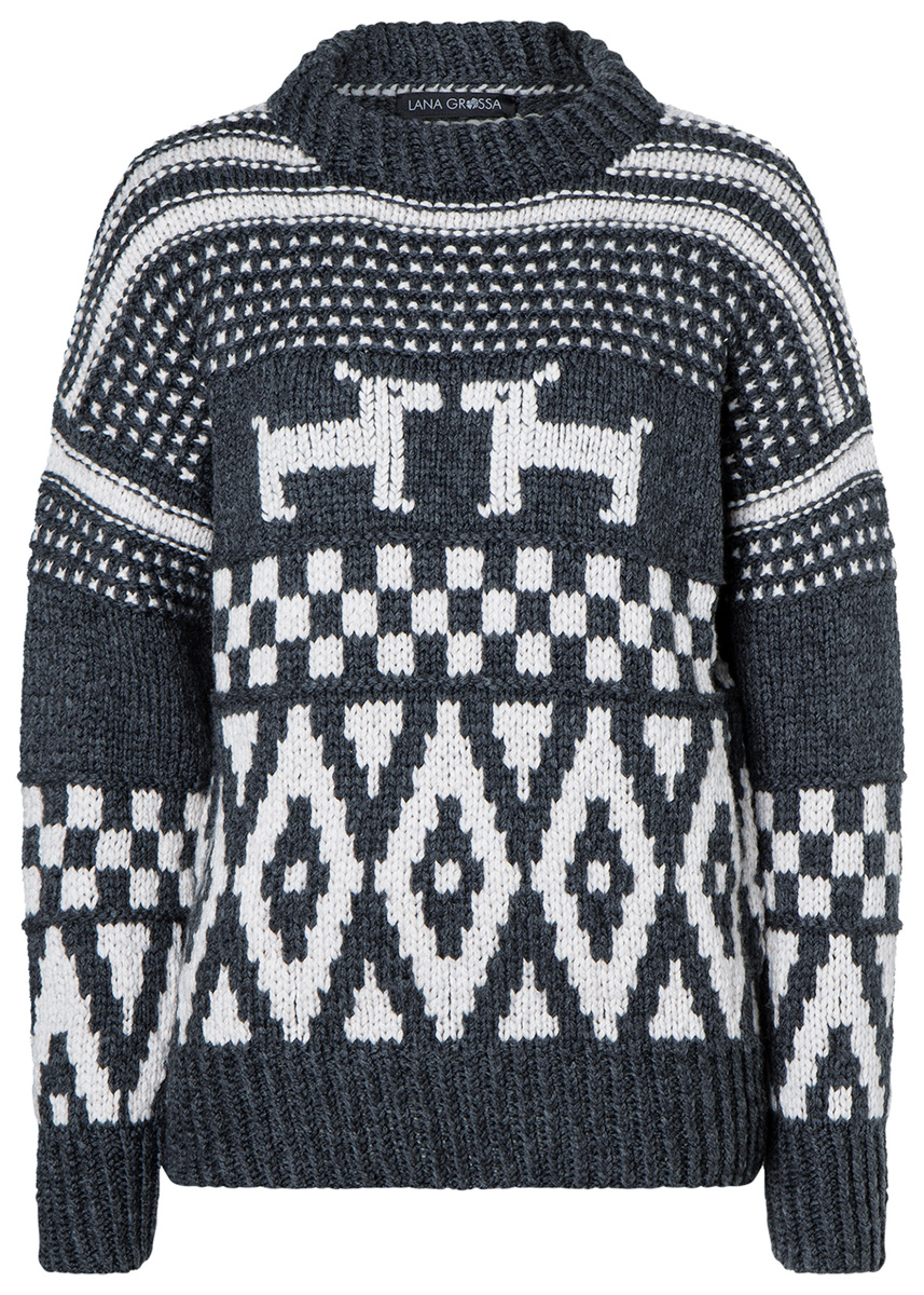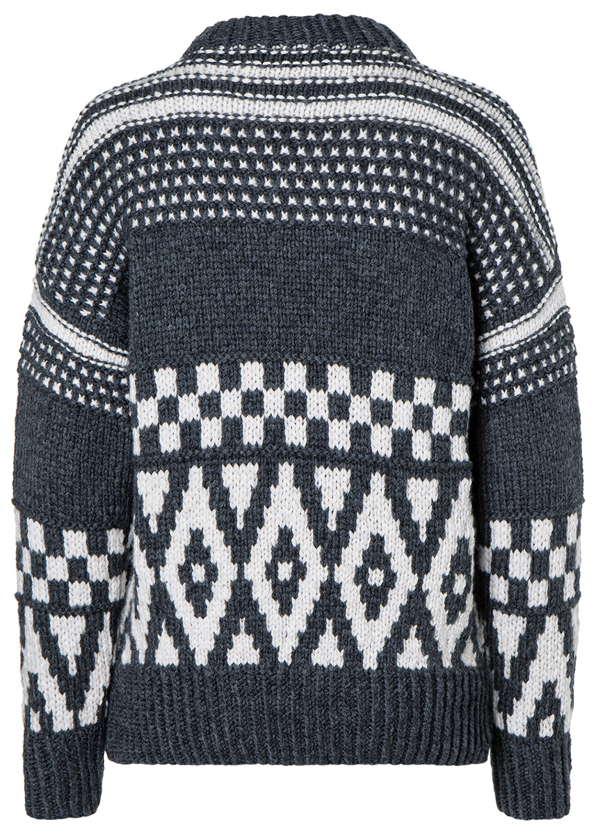 Lana Grossa Alta Moda Cashmere 16 (78% ren ny ull (merino), 12% kashmir, 10% polyamid, löplängd 110 m/50 g), 400 (450 – 500) g nattgrå (färg 13) och 200 (250 – 250) g blomstervit (färg 41); stickor nr. 7 och 8, 1 rundsticka nr. 7, 40 cm lång.