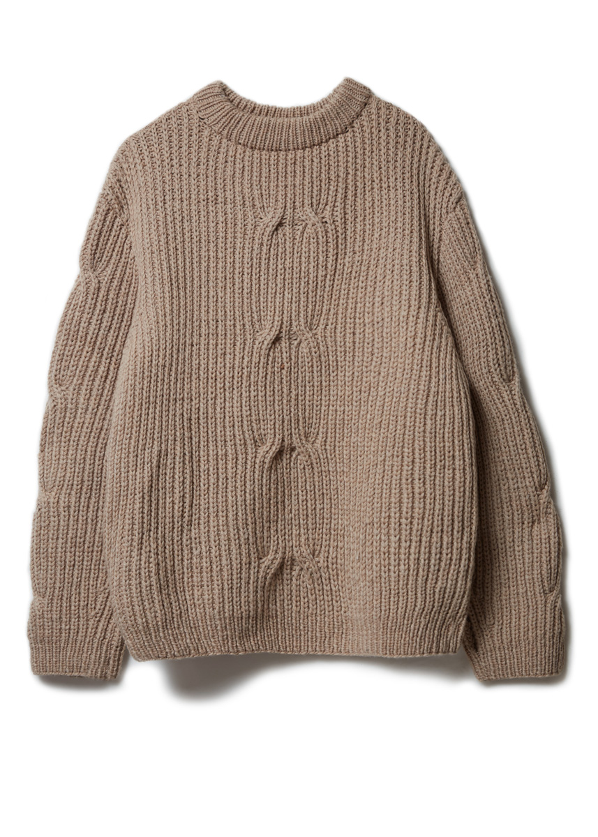 Lana Grossa Alta moda Cashmere 16 (78%  ren ny ull (merino), 12% kashmir, 10% polyamid, löplängd 110 m/50 g), 800 (850 – 900) g beige (färg 76); stickor nr. 6 och 1 rundsticka nr. 6, 40 cm lång, samt 2 flätstickor.