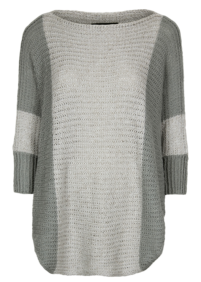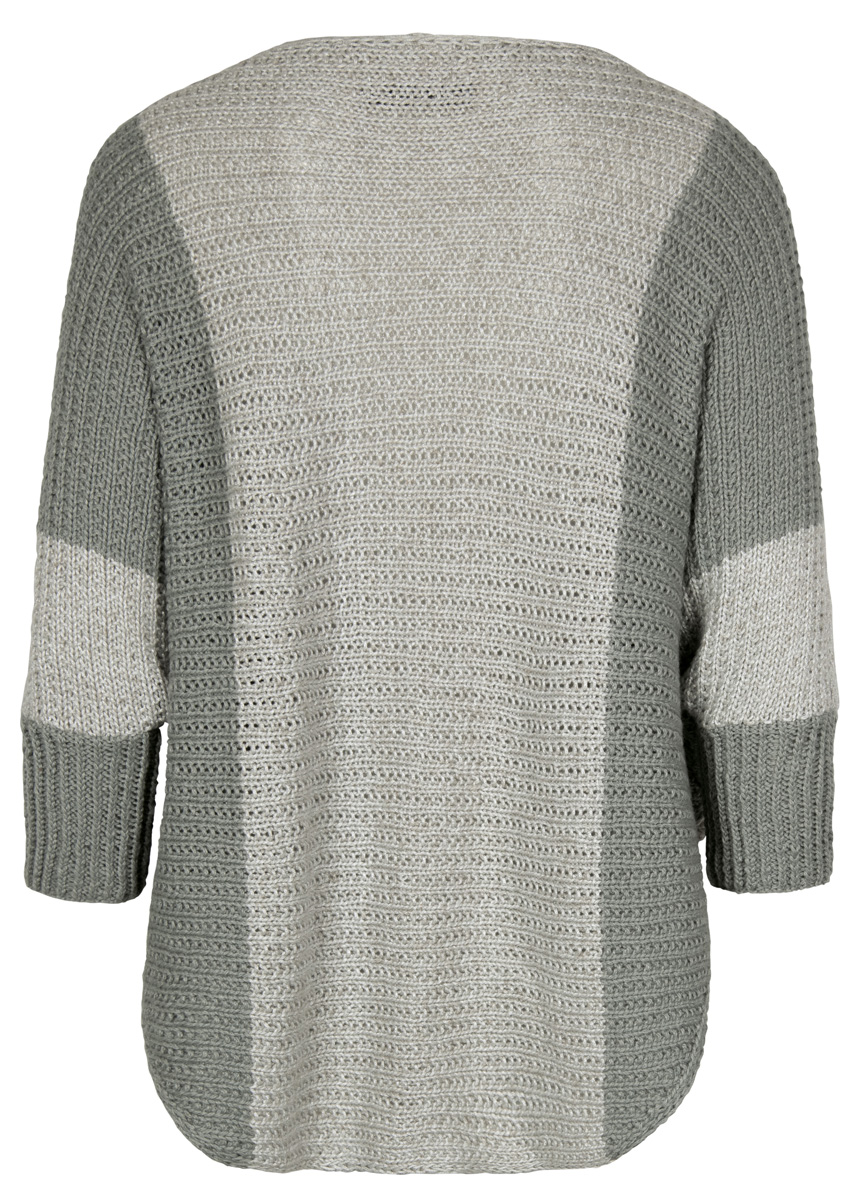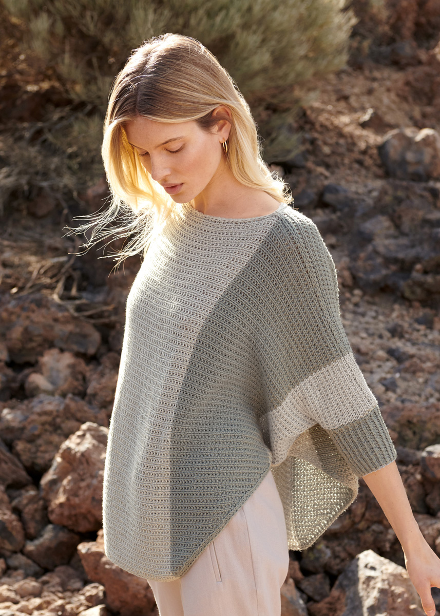Lana Grossa-kvalitet „Alta Moda Cotolana” (45 % ren ny ull (merino), 45 % Pima bomull, 10 % polyamid, löplängd = ca. 150 m/50 g): ca. 250 (300) g gröngrå (färg 9) och Lana Grossa-kvalitet „Linarte” (40 % viskos, 30 % bomull, 20 % lin, 10 % polyamid, löplängd = ca. 125 m/50 g): ca. 300 (350) g silvergrå (färg 60); stickor nr. 5 och 6, 1 rundsticka nr. 6, 80 cm lång.