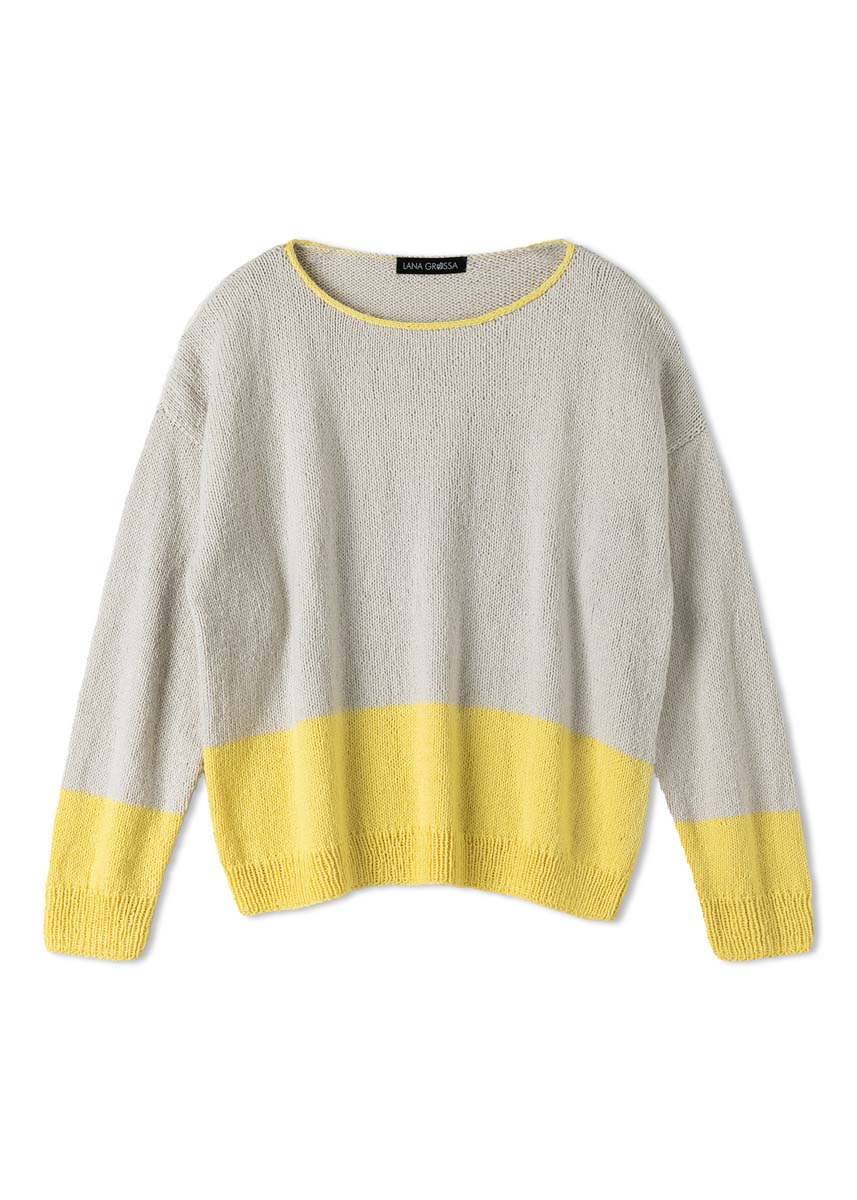 Lana Grossa Alta Moda Cotolana (45% ren ny ull merino, 45% Pima bomull, 10% polyamid, løpelenge 150 m/50 g), 300 (350 – 400 – 450) g lysbeige (farge 19) og 150 (200 – 200 – 250) g lysgelb (farge 61); pinner nr. 3,5 og 4, samt 1 rundpinne nr. 3,5, 40 cm lang.