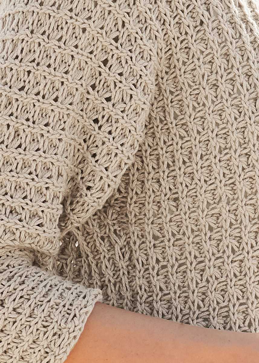 Lana Grossa Alta Moda Cotolana (45% ren ny ull merino superwash, 45% bomull, 10% polyamid, löplängd 150 m/50 g), 350 (400 – 450) g grège (färg 8); stickor nr. 5,5, 1 rundsticka nr. 5,5, 100 cm lång, 1 rundsticka nr. 4,5, 40 cm lång.