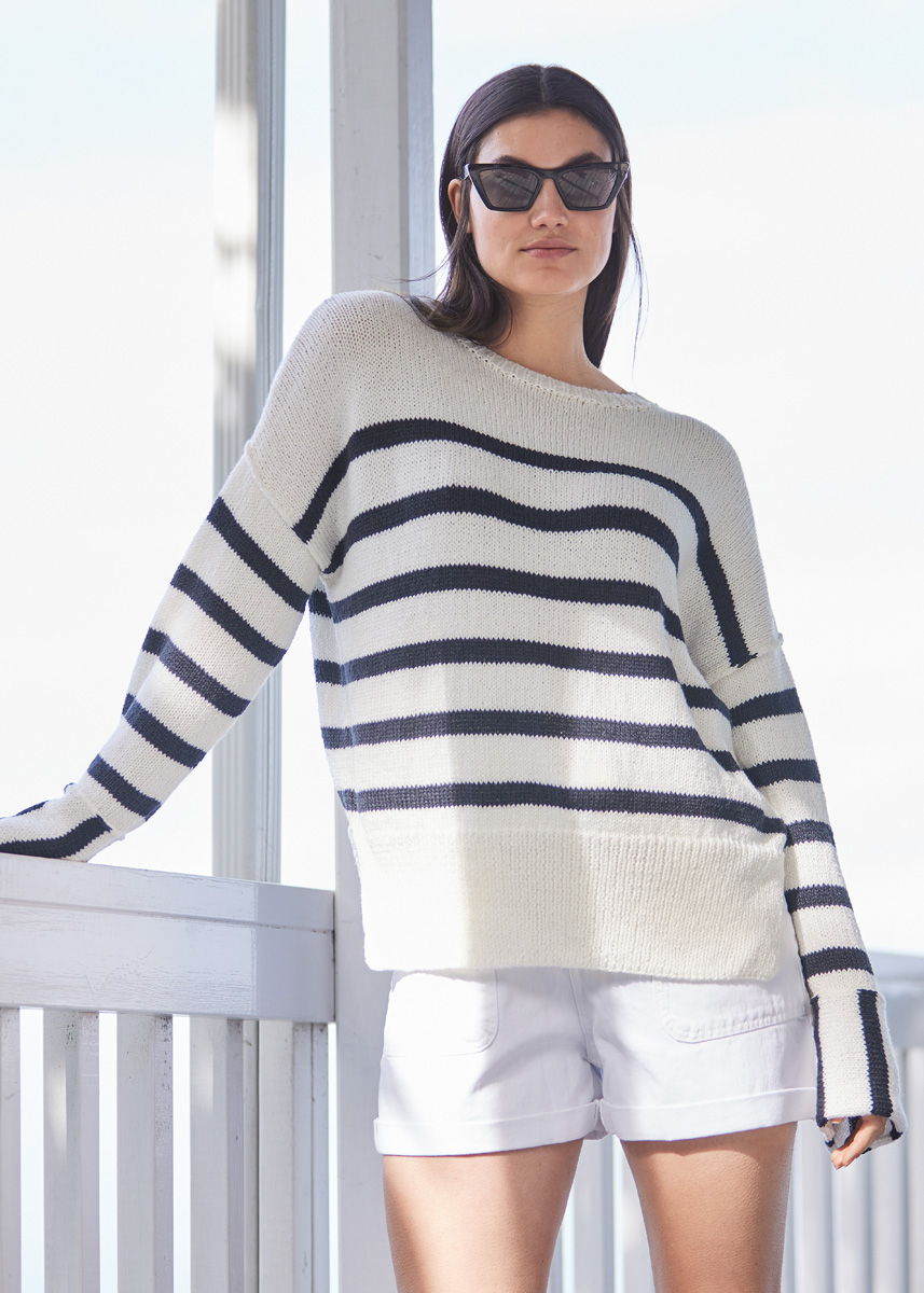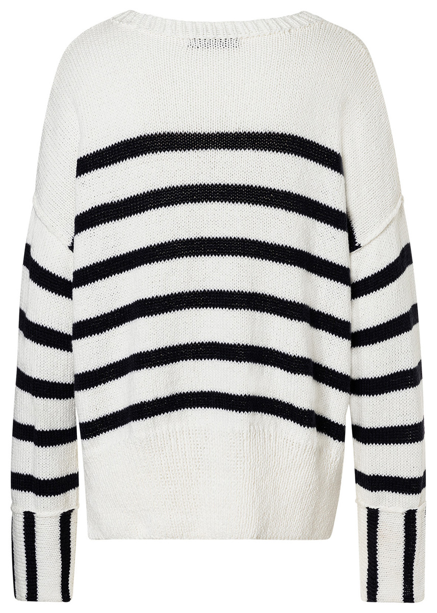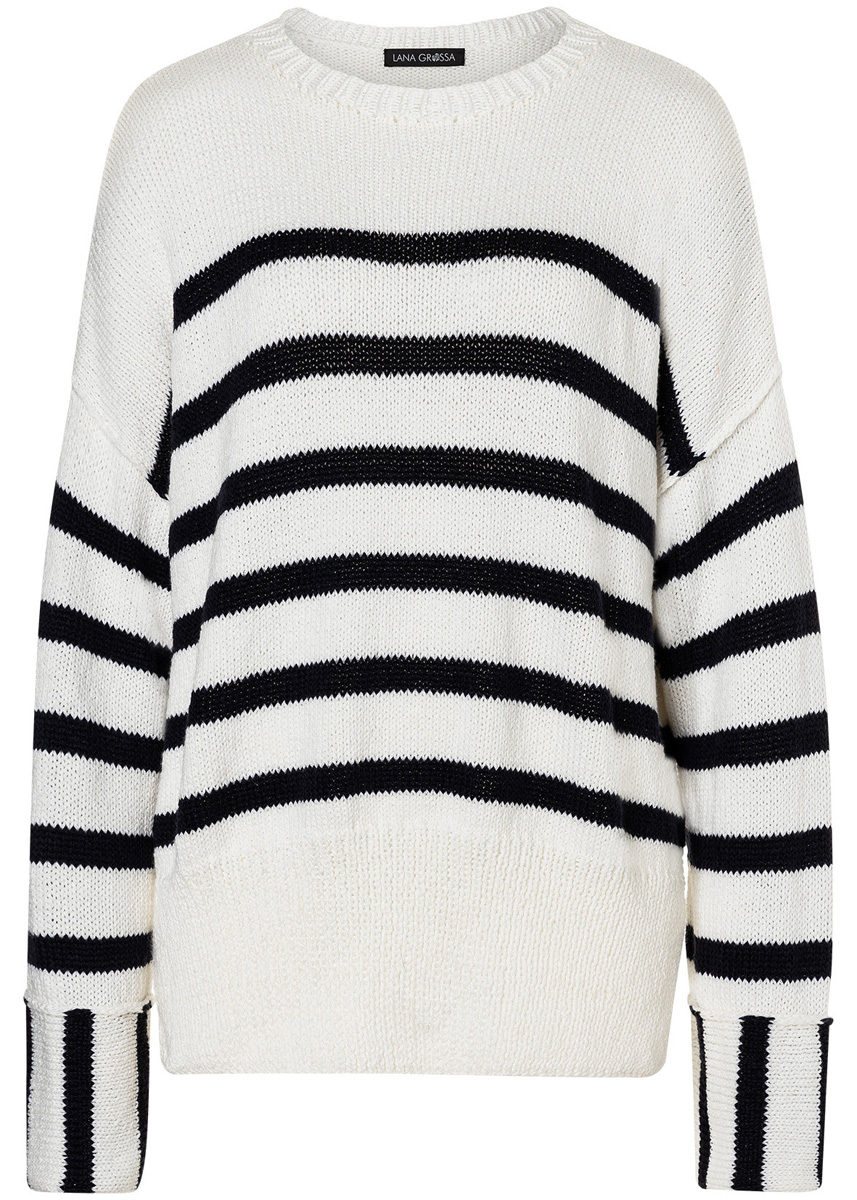 Lana Grossa Alta Moda Cotolana (45% ren ny ull (merino), 45% bomull (Pima), 10% polyamid, löplängd 150 m/50 g), 350 (400 – 450) g ljus beige (färg 19) och 150 (150 – 200) g nattblå (färg 29); stickor nr. 4 och 1 rundsticka nr. 4, 40 cm lång.
