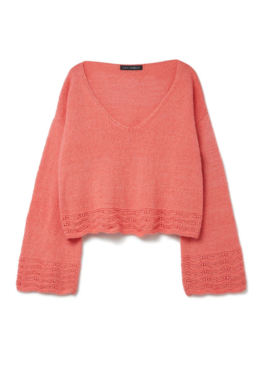 Lana Grossa Alta moda Cotolana (45% ren ny ull (merino), 45% (Pima) bomull, 10% polyamid, löplängd 150 m/50 g), 400 (450 – 500) g korall (färg 52); stickor nr. 4,5 och 1 virknål nr. 4.