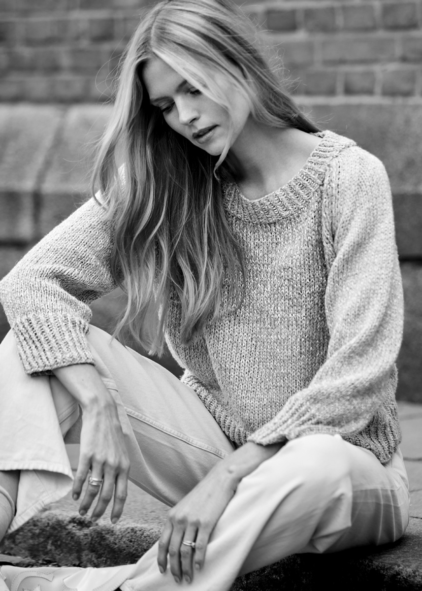 Lana Grossa Amoroso (33% ren ny ull, 32% polyacryl, 14% silke, 14% bomull, 7% polyamid, löplängd 400 m/100 g), 300 (400 – 400 – 500) g [3 (4 – 4 – 5 nystan] gammelrosa/fuchsia/orange (färg 5) och Lana Grossa Brillino (83% viskos, 17% metallfibrer, löplängd 200 m/25 g), 150 (200 – 200 – 250) g [6 (8 – 8 – 10) nystan] vit/guld (färg 9); stickor nr. 6 och 8, 1 rundsticka nr. 6, 40 cm lång
