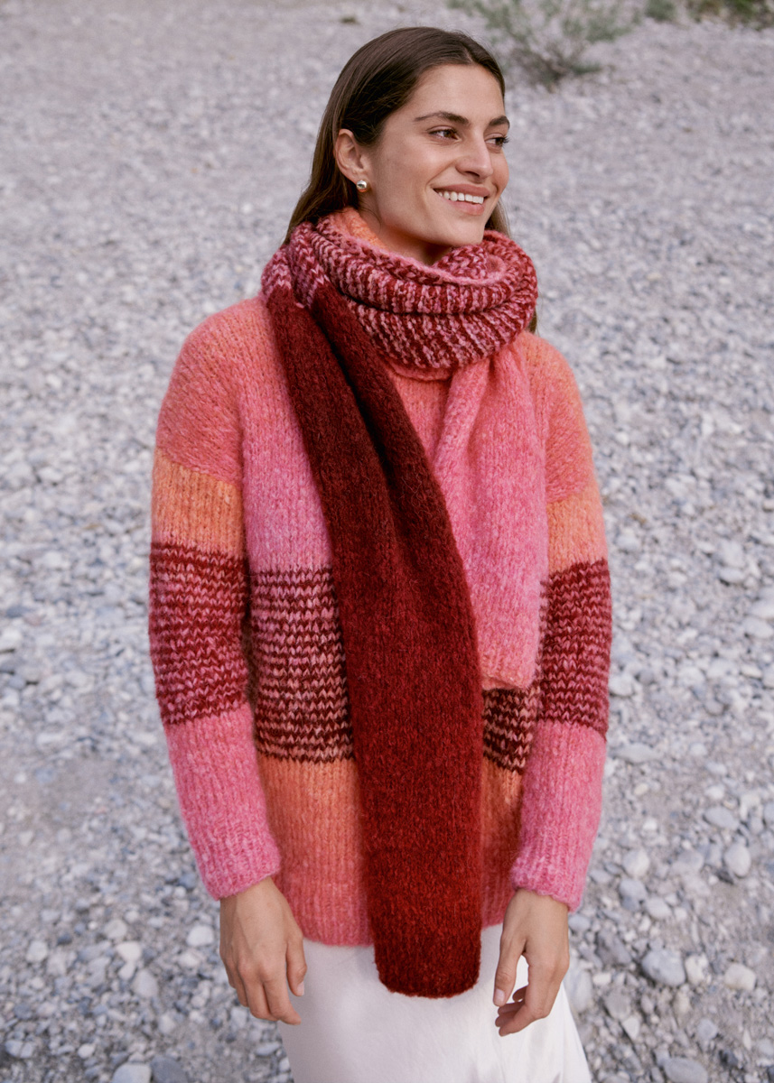Lana Grossa „Avio“ (63% alpacka (Fine), 37% polyamid, löplängd = 150 m/50 g): 200 (250 - 300) g i hallon/aprikos (färg 12) och 50 g i orientröd/mörk röd (färg 14); rundstickor nr. 5 och nr. 7, 80 cm lång, 1 rundsticka nr. 5, 40 cm lång.