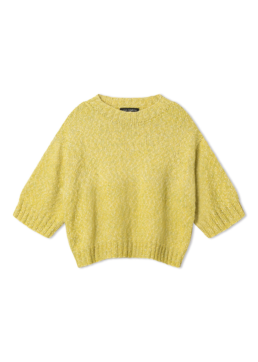 Lana Grossa-kvalitet „Bottoni“ (53 % bomull, 24 % viskose, 23 % ren ny ull (merino extrafine), løpelengde = ca 125 m/50 g): ca 400 (400 - 450 - 450) g citrusgul/creme (farge 19); pinner nr. 3,5 og 4,5; 1 kort rundpinne nr. 3.