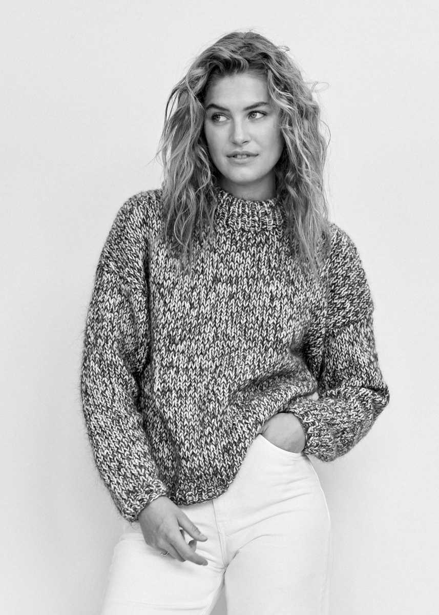 Lana Grossa Brigitte No. 2 (47% alpacka (baby), 45% bomull, 8% ren ny ull (merino), löplängd 140 m/50 g), 250 (300 – 300) g råvit (färg 16) och Lana Grossa Brigitte No. 3 (57% ren ny ull (extrafin merino), 20% mohair (superkid), 23% polyamid, löplängd 100 m/25 g), 175 (200 – 200) g anthracit (färg 11); stickor nr. 7 och 9, samt 1 rundsticka nr. 7, 40 cm lång. Obs: Modellen stickas med dubbla trådar, 1 tråd Brigitte No. 2 och 1 tråd Brigitte No. 3!