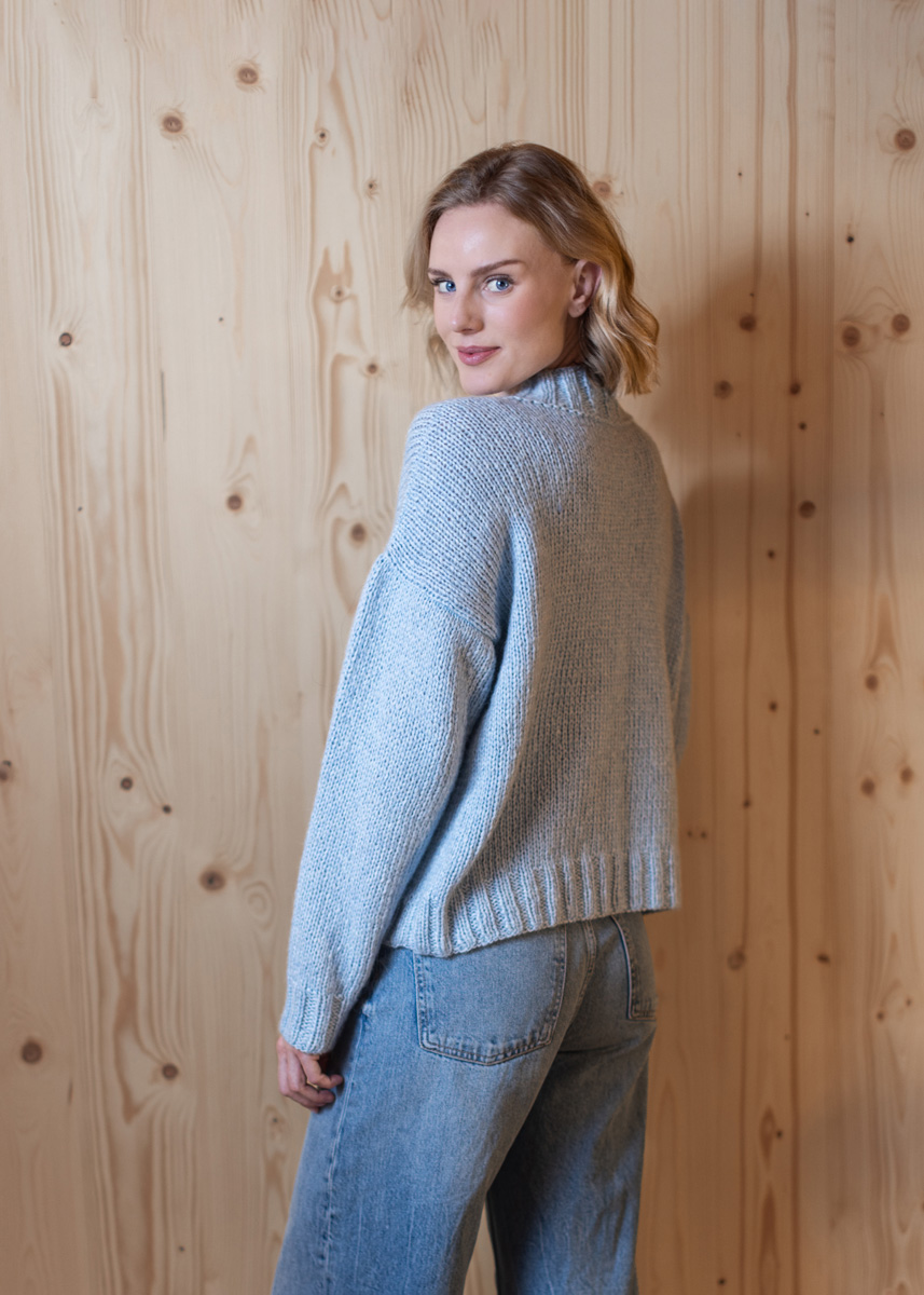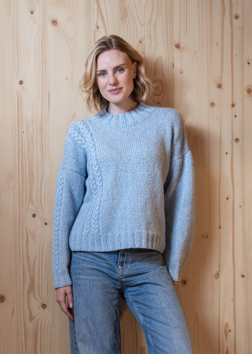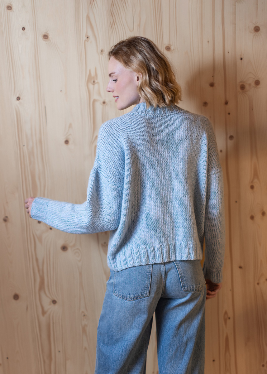• 350 (350 - 400 - 400 - 450 - 450) g lysande blå (färg 65) • Stickor nr. 4,5 och 5,5 • Rundsticka nr. 4,5 / 40 cm