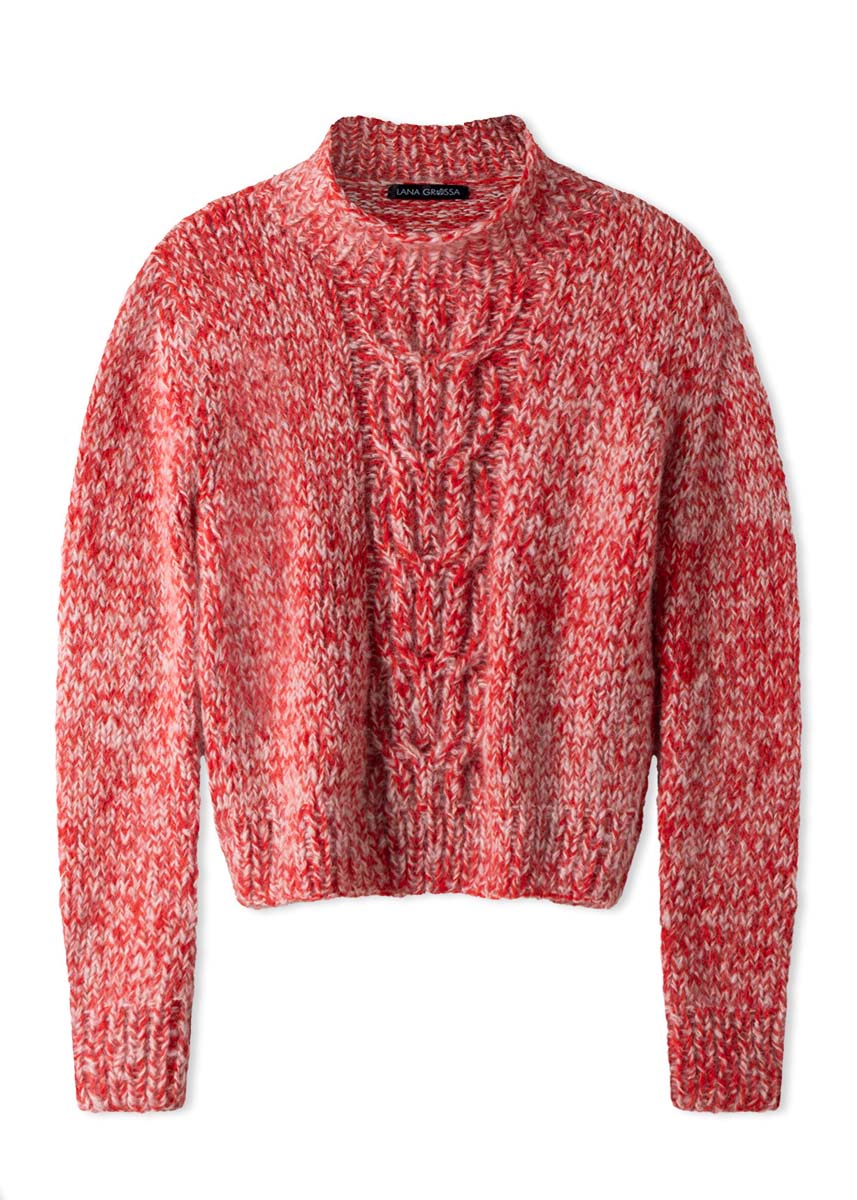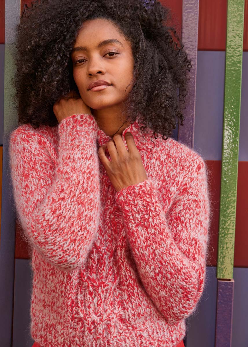 Lana Grossa Brigitte No. 2 (47% alpakka (baby), 45% bomull, 8% ny ull (merino), løpelengde = ca. 140 m/50 g), 250 (300 - 350) g refleksrød (farge 74) og Lana Grossa Mohair Moda (70% mohair (kid mohair), 20% ren ny ull (merino superfin), 10% polyamid, løpelengde = ca. 140 m/50 g), 200 (250 - 300) g råhvit (farge 18); strikkepinne nr. 6 og nr. 8; en 50 cm lang rundpinne nr. 6; 1 hjelpepinne.