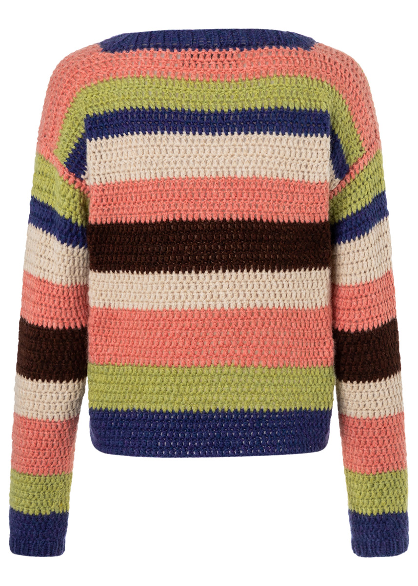 Lana Grossa „Brigitte No. 2“ (47% alpacka (baby), 45% bomull, 8% ren ny ull (merino), löplängd 140 m/50 g), 100 (150 – 150) g lax (färg 46), 100 (150 – 150) g ljusbeige (färg 47), 100 (150 – 150) g kiwi (färg 39), 100 (150 – 150) g blåviolett (färg 53) och 50 (100 – 100) g mokka (färg 44); 1 virknål nr. 6, strumpstickor nr. 6 och 1 rundsticka nr. 6, 40 cm lång.