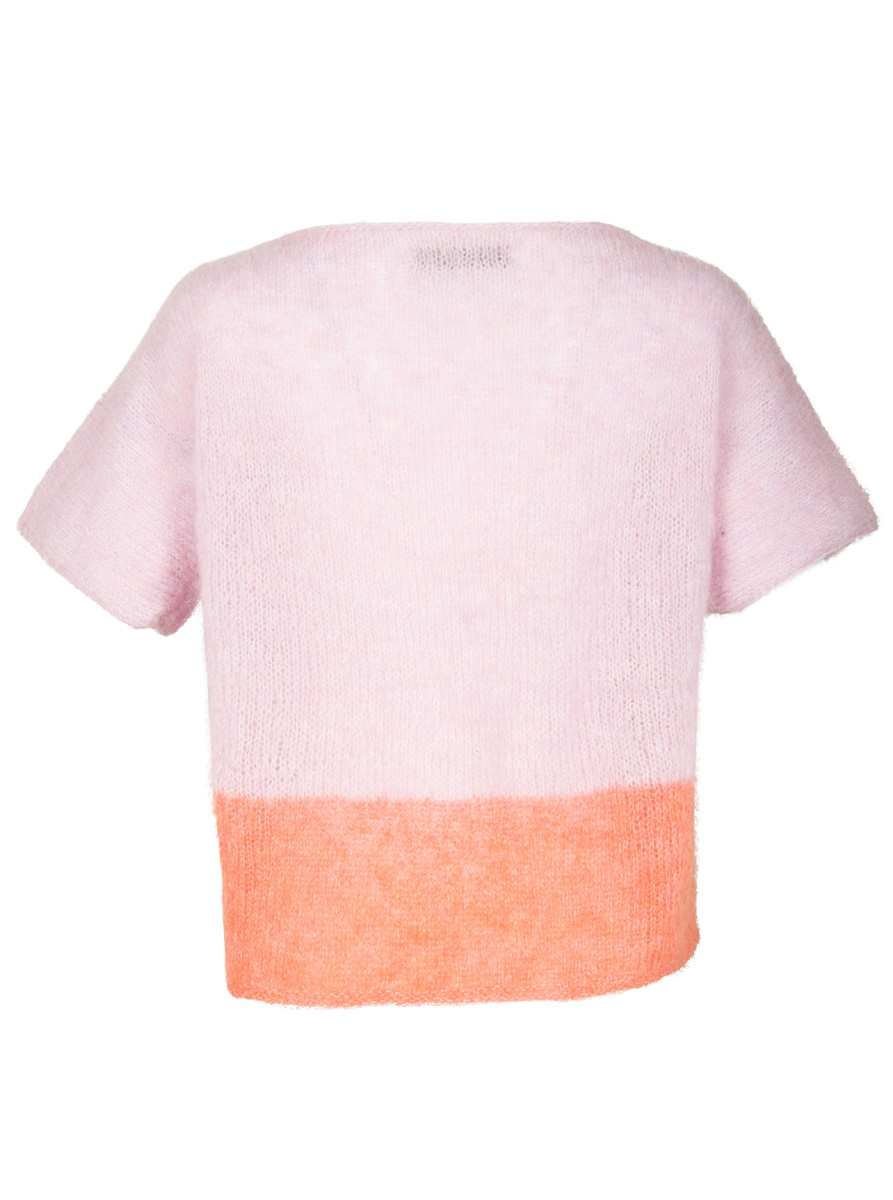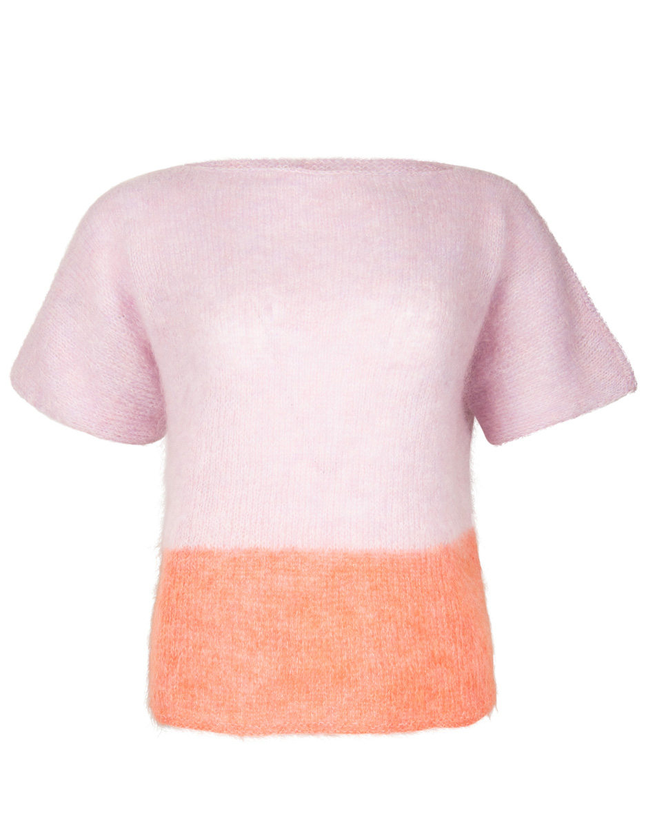 Lana Grossa-kvalitet ”Brigitte No. 3” (40 % mohair, 37 % ren ny uld, 23 % polyamid, løbelængde = ca. 100 m / 25 gr.): ca. 100(100) gr syren-rosa (fv 7) og 25(50) gr laks (fv 3), strikkepinde nr. 4½. 2 strømpepinde nr. 4 og hæklenål nr. 4