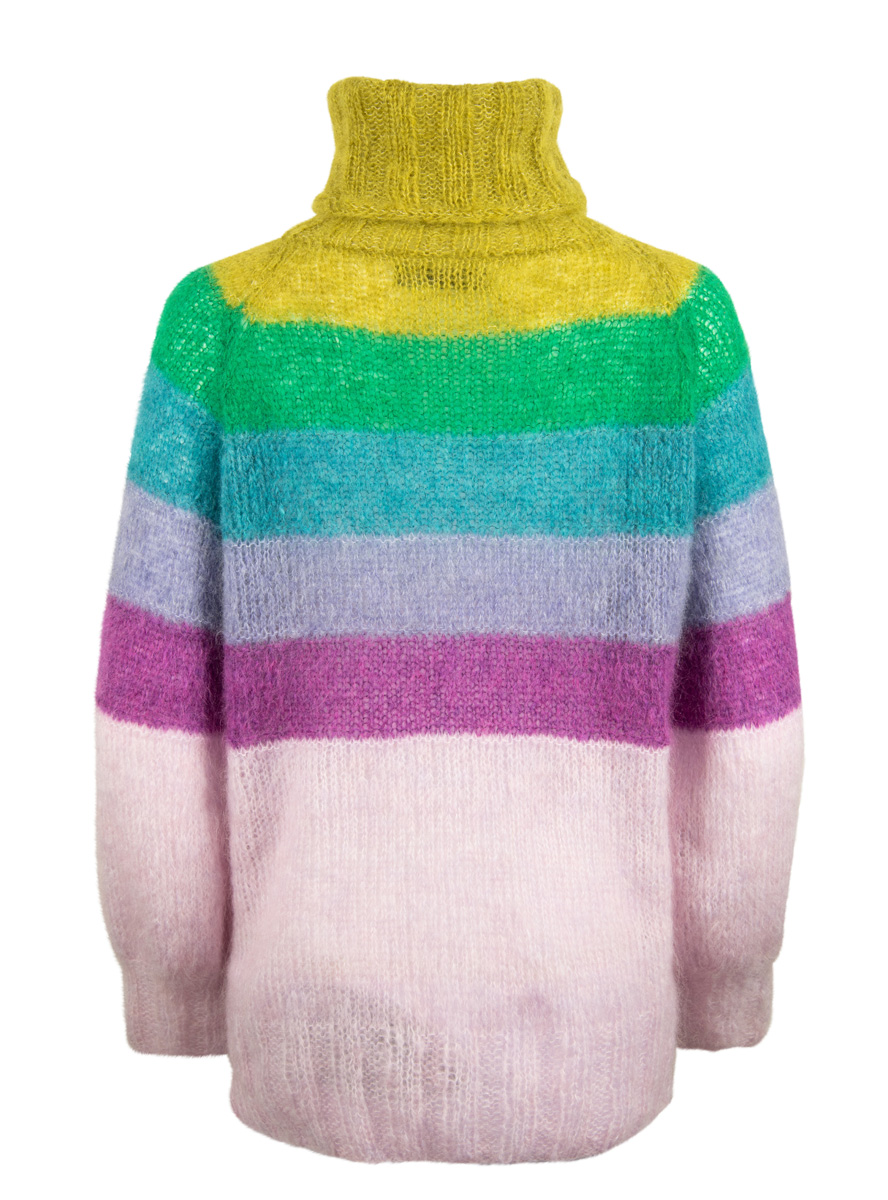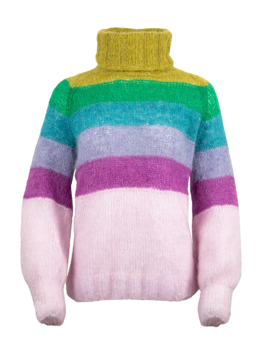 Lana Grossa-kvalitet ”Brigitte No. 3” (40 % mohair, 37 % ren ny uld, 23 % polyamid, løbelængde = ca. 100 m / 25 gr.): ca. 75(100-100) gr syren-rosa (fv 7), 50(75-75) gr oliven (fv 14) samt 25 gr violet (fv 5), lilla (fv 6), grøn (fv 15) og petrol (fv 16). Strikkepinde nr. 6, strømpepinde nr. 6