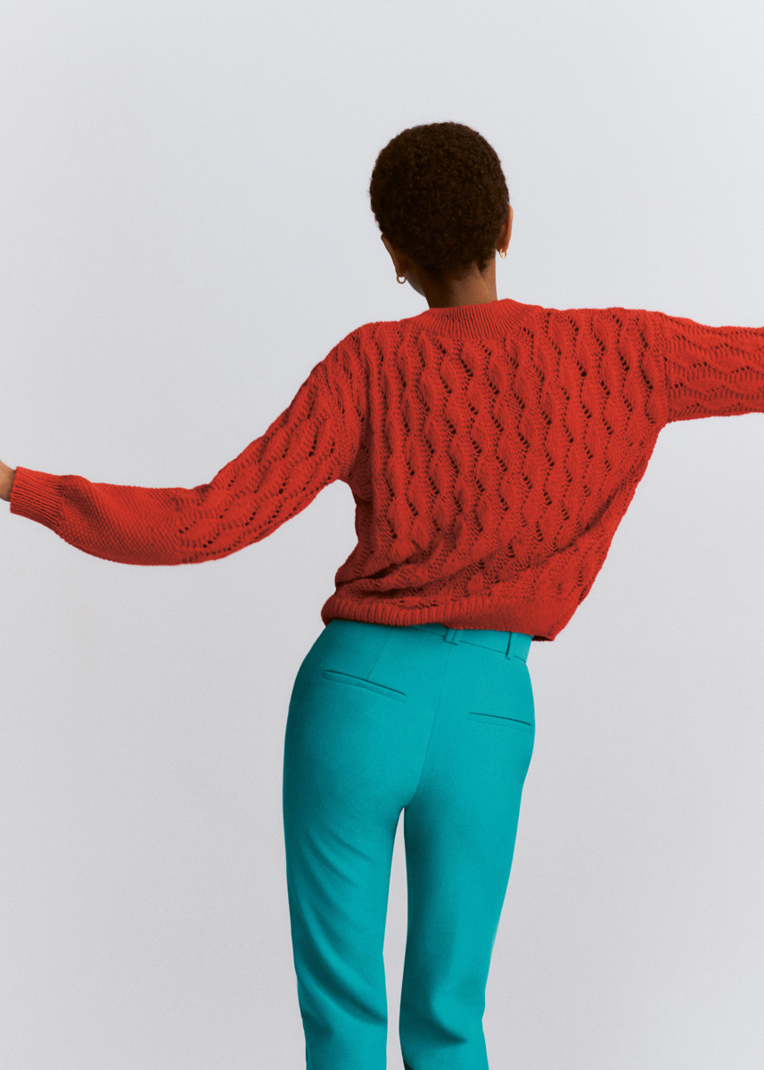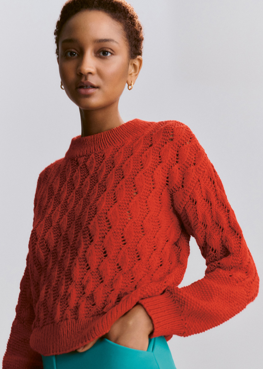 Lana Grossa-kvalitet „Brigitte No. 4“ (80 % bomull, 20 % (baby) alpacka, löplängd 110 m/50 g): ca. 500 (550) g eldröd (färg 22); stickor nr. 3,5 och 4, 1 rundsticka nr. 3,5, 50 cm lång.