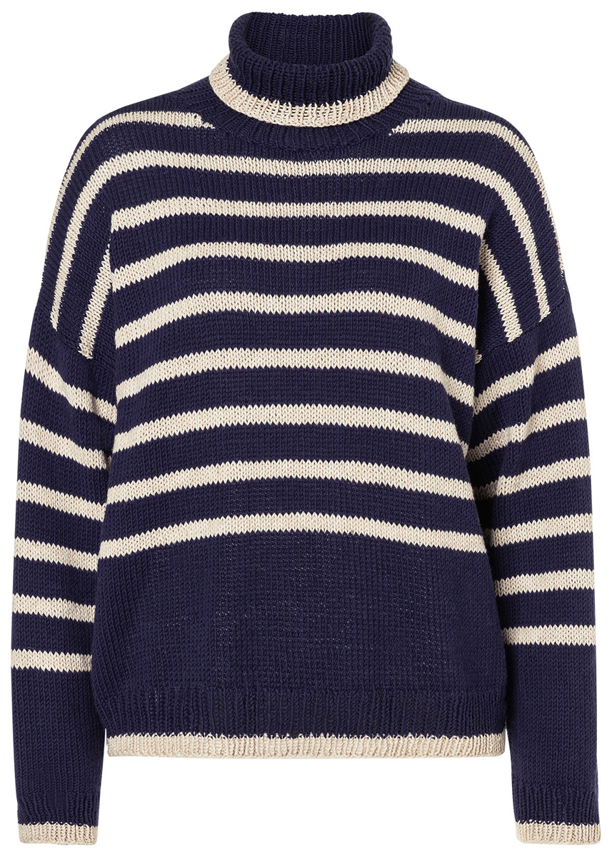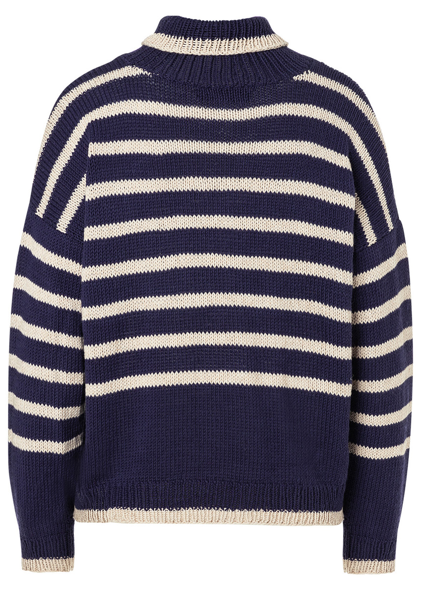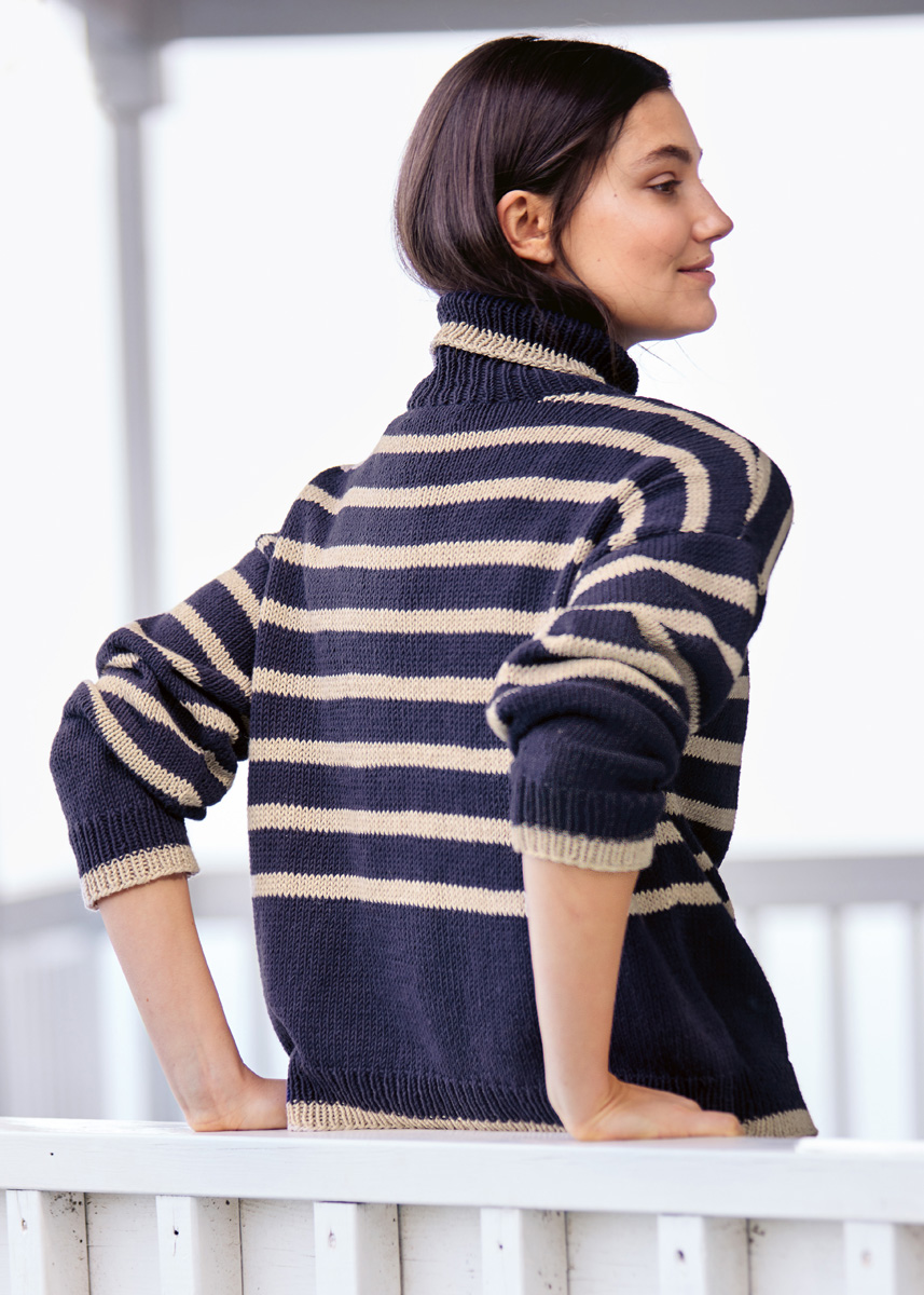 Lana Grossa Brigitte No. 4 (80% bomull, 20% alpacka (baby), löplängd 110 m/50 g), 350 (400 – 450) g nattblå (färg 15) och 150 (200 – 250) g ljus beige (färg 2); stickor nr. 4 och 4,5, 1 rundsticka nr. 4, 40 cm lång.