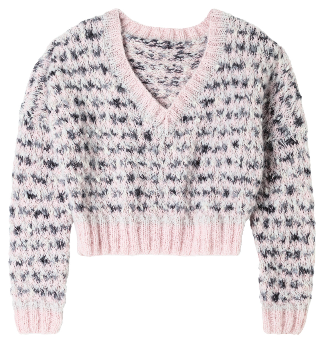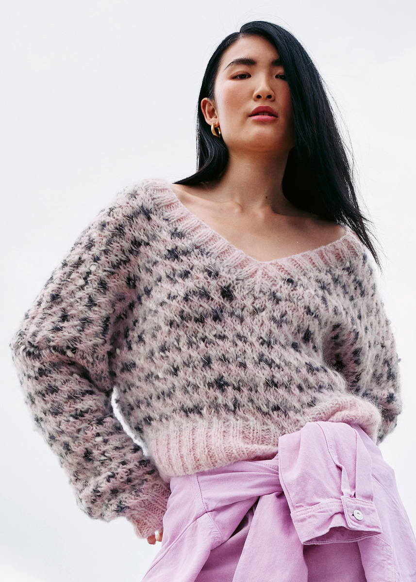Lana Grossa Lala Berlin Brushy (42% mohair (superkid) 38% ren ny ull (merino), 20% polyamid, löplängd 135 m/50 g), 100 (150 – 200) g mjuk rosa (färg 14) och 100 (150 – 200) g silvergrå (färg 11), Lana Grossa Lala Berlin Hazy (40% alpacka (baby), 25% ren ny ull (merino superfine), 25% polyamid, 6% tencel, 4% bomull, löplängd 250 m/50 g), 100 (150 – 150) g brun/turkos (färg 11) och Lana Grossa Brillino (83% viskos, 17% metallfibrer, löplängd 200 m/25 g), 150 (175 – 200) g vit/rosa (färg 8); stickor nr. 6 och 7, samt 1 rundsticka nr. 6, 40 cm lång, 1 flätsticka.