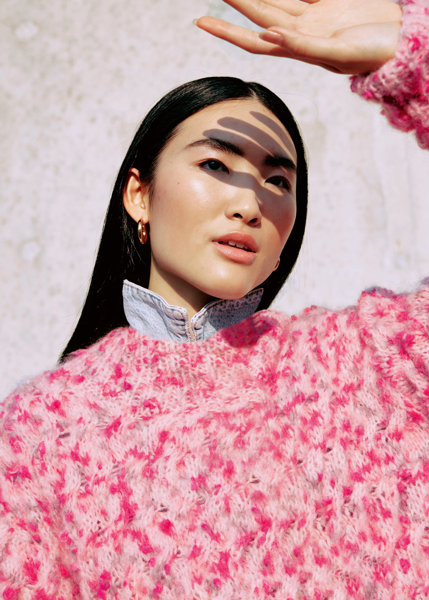 Lana Grossa Lala Berlin Brushy Print (40% ren ny ull (merino), 36% mohair (superkid), 13% polyamid, 11% bomull, löplängd 115 m/50 g), 350 (400 – 450) g mjuk rosa/nejlika/pink/grå (färg 201); stickor nr. 4,5 och 6, 1 rundsticka nr. 4,5, 40 cm lång, 1 flätsticka.