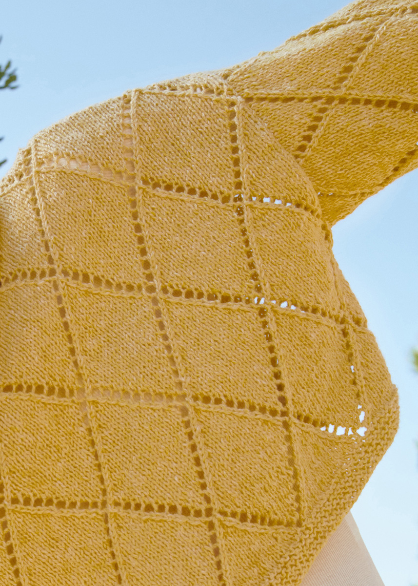 Lana Grossa-kvalitet „Cara“ (57% alpacka (baby), 33% bomull, 10% ren ny ull (merino), löplängd = ca. 120 m/50 g), 400 (450 – 500) g gul (färg 2); stickor nr. 4 och 4,5, 1 rundsticka nr. 4, 40 cm lång.