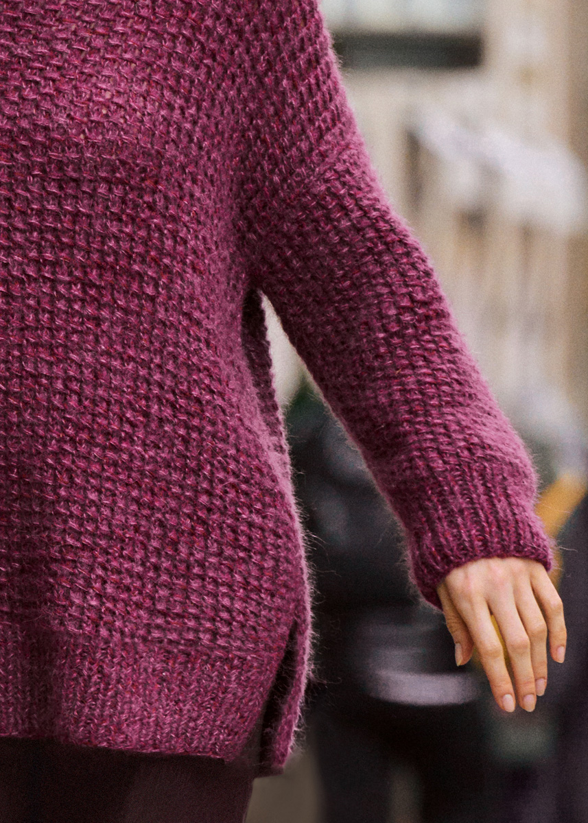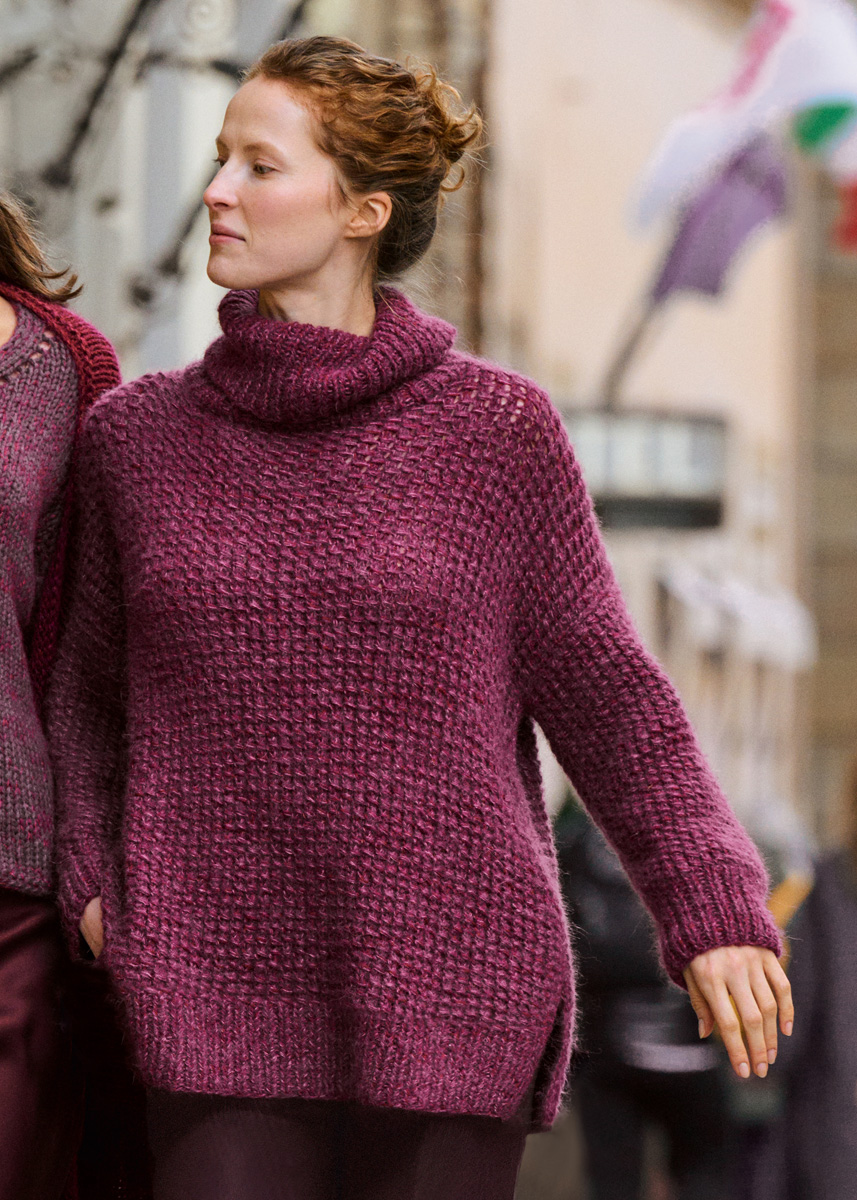 Garn: Lana Grossa «Cashmere 16 Fine» (80 % ren ull (merino), 10 % kashmir, 10 % polyamid, LL = ca. 320 m/50 g): Ca. 100 (150 - 150 - 150) g burgunder (frg 58), Lana Grossa «Setasuri» (69 % alpakka (suri), 31 % silke, LL = ca. 212 m/25 g): Ca. 125 (150 - 175 - 200) g bordeaux (frg 31). Pinner: Nr. 7 og 8, kort rundp nr. 7.