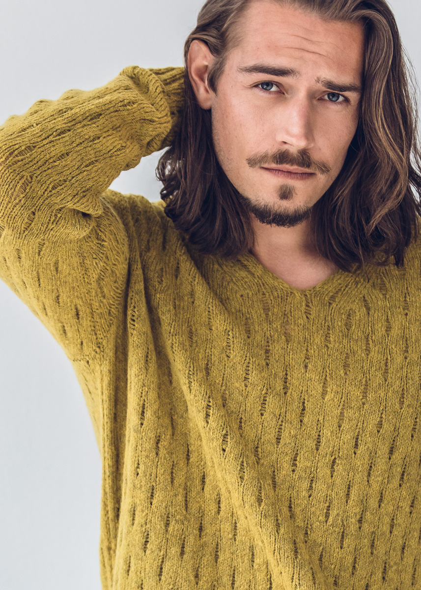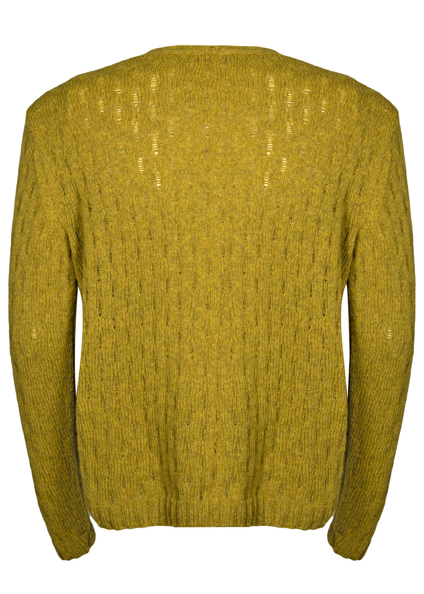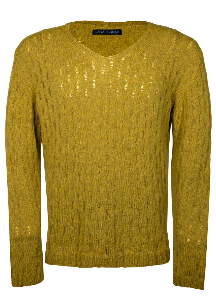 Lana Grossa Cashmere 16 Fine (80% ren ny ull, 10% kashmir, 10% polyamid, löplängd 320 m/50 g), 300 (350 – 400) g senap (färg 35); stickor nr. 4, 1 hjälpsticka.