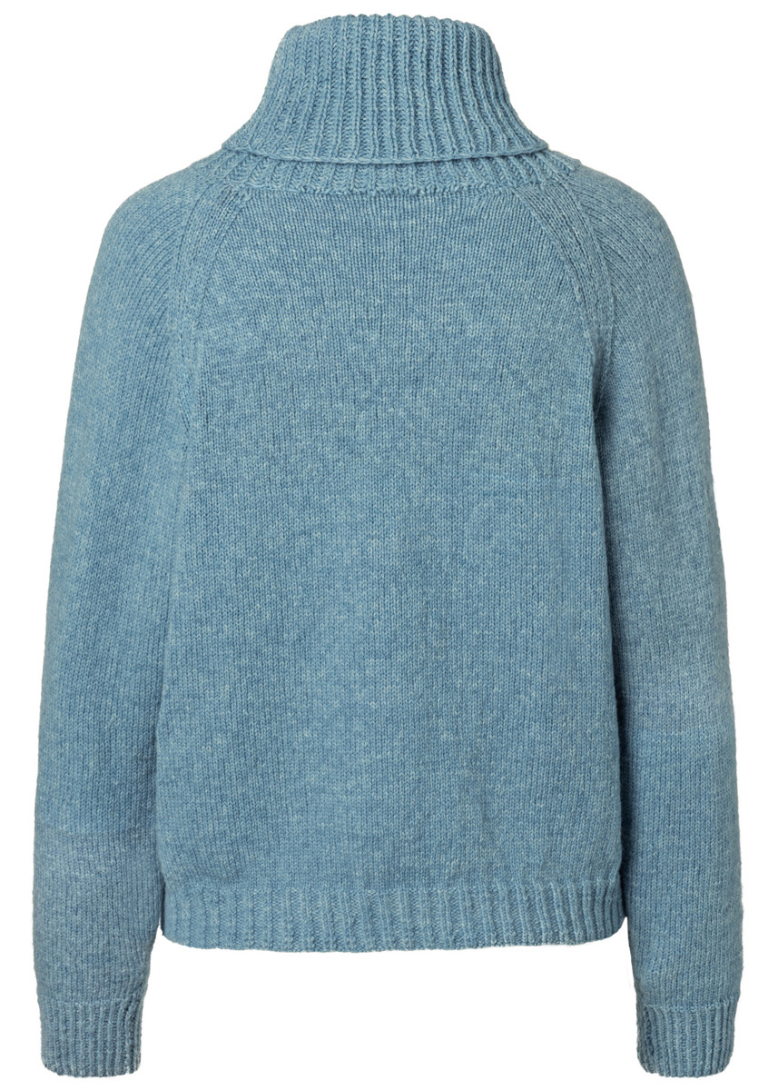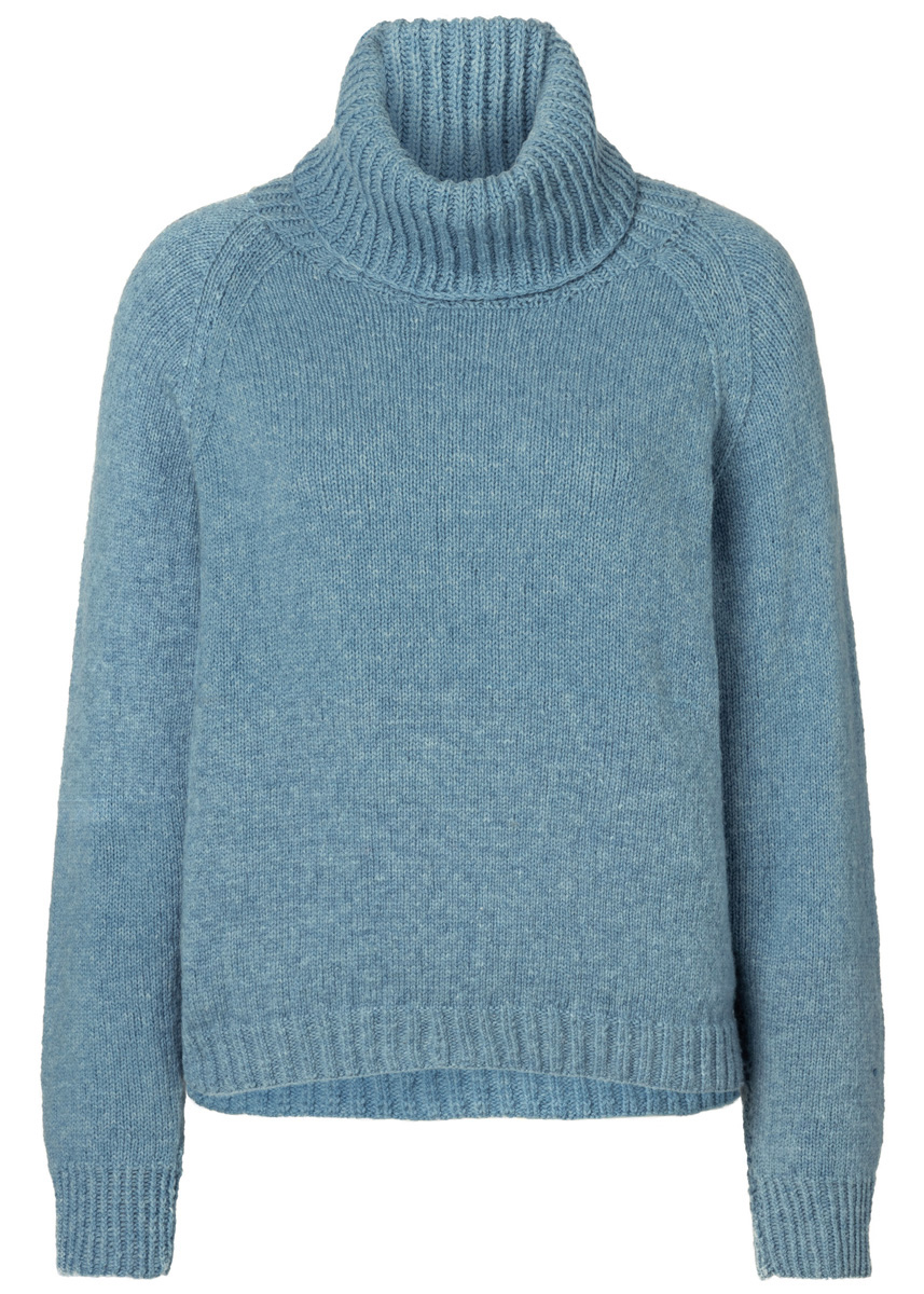 Lana Grossa Cashmere 16 Fine (80% ren ny ull (merino), 10% kashmir, 10% polyamid, löplängd 320 m/50 g), 300 (350 – 400) g ljus blå (färg 28); stickor nr. 3,5 och 4, 1 rundsticka nr. 4, 40 cm lång.