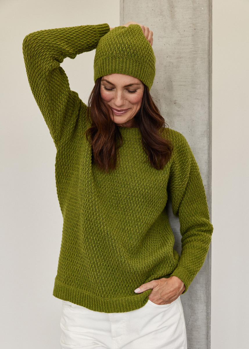 Lana Grossa Cashmere 16 Fine (80% ren ny ull (merino), 10% kashmir, 10% polyamid, löplängd 320 m/50 g), 550 (600 – 650) g limette (färg 42); 1 virknål nr. 3 och 3,5.