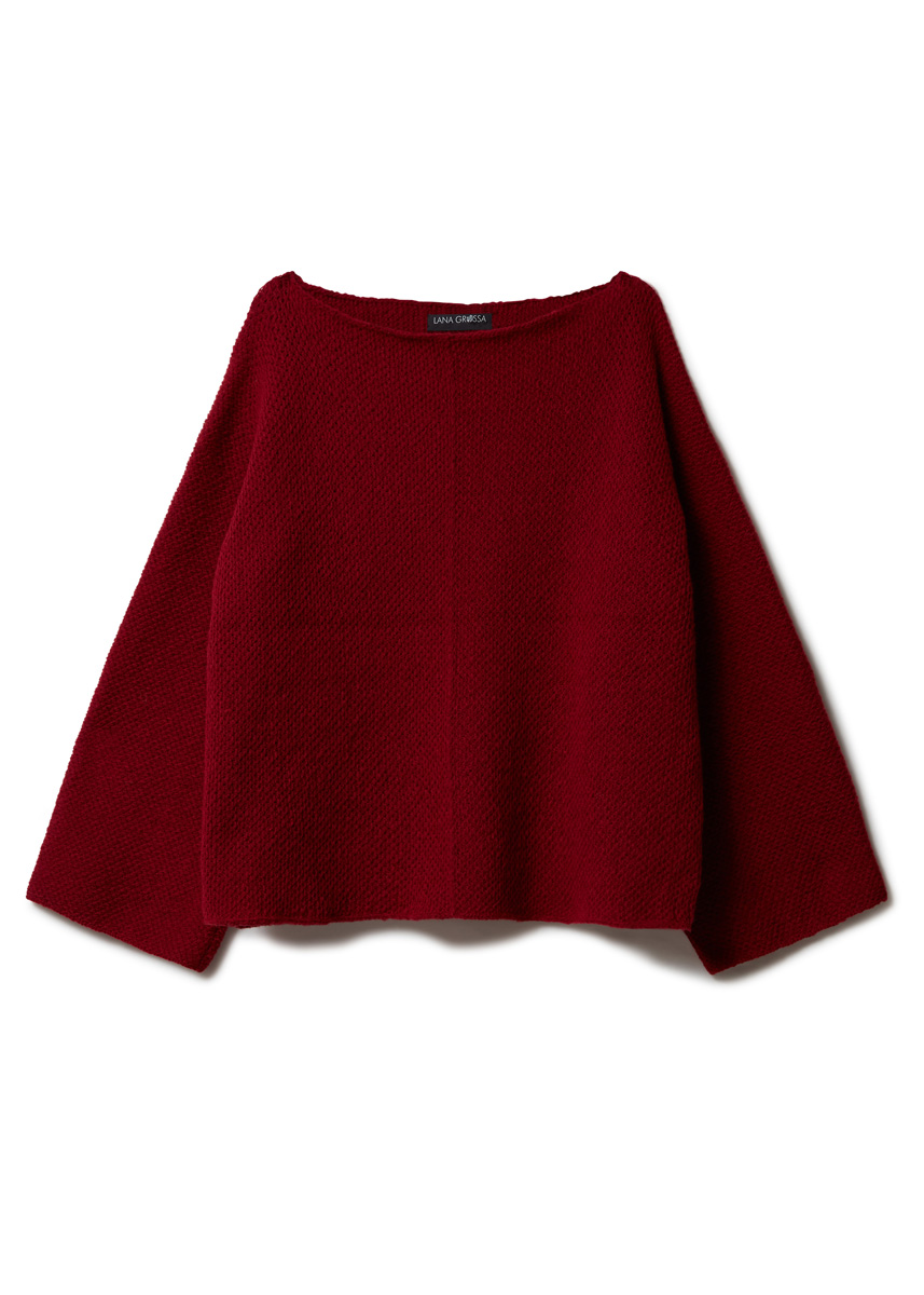 Lana Grossa Cashmere 16 Fine (80% ren ny ull (merino), 10% kashmir, 10% polyamid, löplängd 320 m/50 g), 350 (400 – 450 – 500) g vinröd (färg 57); 1 rundsticka nr. 5, 100 cm lång, 2 vajrar till rundsticka, 60 cm lång och 1 flätsticka.