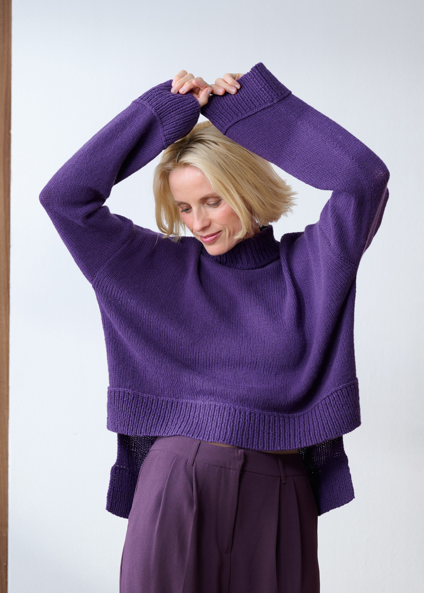 Lana Grossa Cashmere Pure (100% kasjmir, løpelengde 115 m/25 g), 375 (400 – 425 – 450) g aubergine (farge 23); strikkepinner nr. 3,5 og 4, såvel som strømpepinner nr. 3,5 og 4. TIPS: Kun vrangbordkantene og kragen strikkes med dobbel tråd!