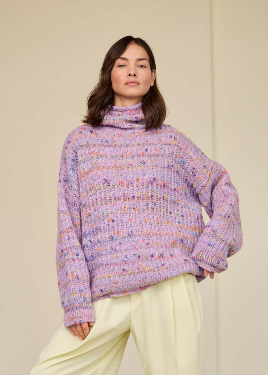 Lana Grossa «Cassata» (54 % ren ny ull (merino extrafine), 30 % polyamid, 16 % bomull, LL = ca. 175 m/50 g): 300 (350 - 350 - 400) g dus lilla/rosa/gul/lilla (frg 3) Pinner: Nr. 5 og 5,5, kort rundpinne nr. 5