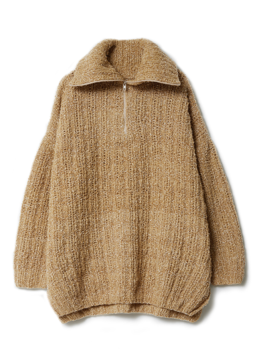 Lana Grossa „Cocco“ (62% ren ny ull (merino), 25% bomull, 12% polyamid, 1% elasthan, löplängd 135 m/50 g), 500 (550 – 600) g beige (färg 3); stickor nr. 4 och 6, 1 rundsticka nr. 4, 40 cm lång, 1 blixtlås, plast, färg beige, 36 cm lång.