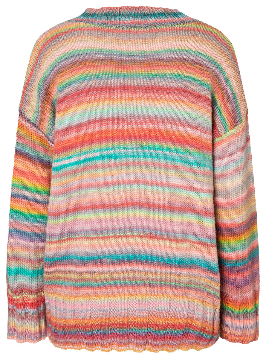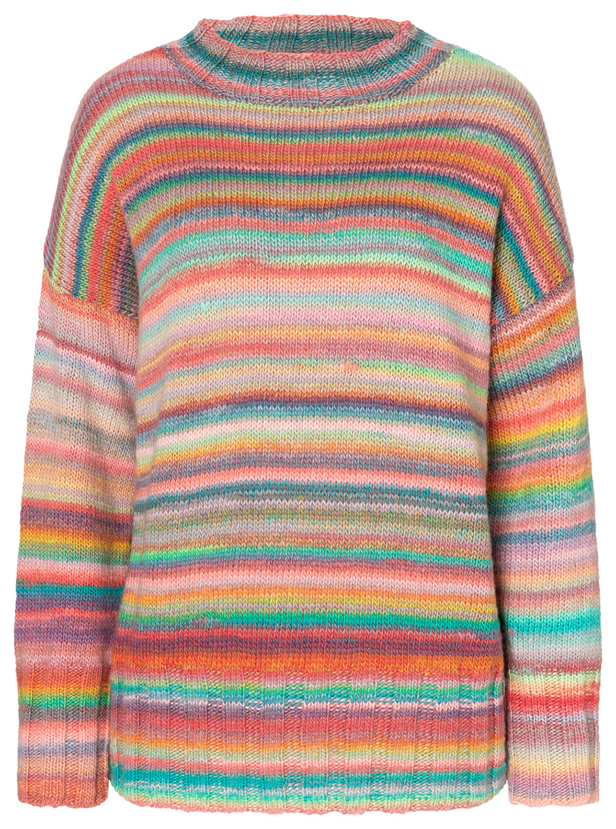 Lana Grossa-kvalitet „Colorissimo” (100 % ren ny ull (extrafin merino), löplängd = ca. 300 m/100 g): ca. 400 (500 – 500) g lax/korall/orangegul/gul/turkos/syren/rosa (färg 11); stickor nr. 4 och 5, 1 rundsticka nr. 4, 40 cm lång.