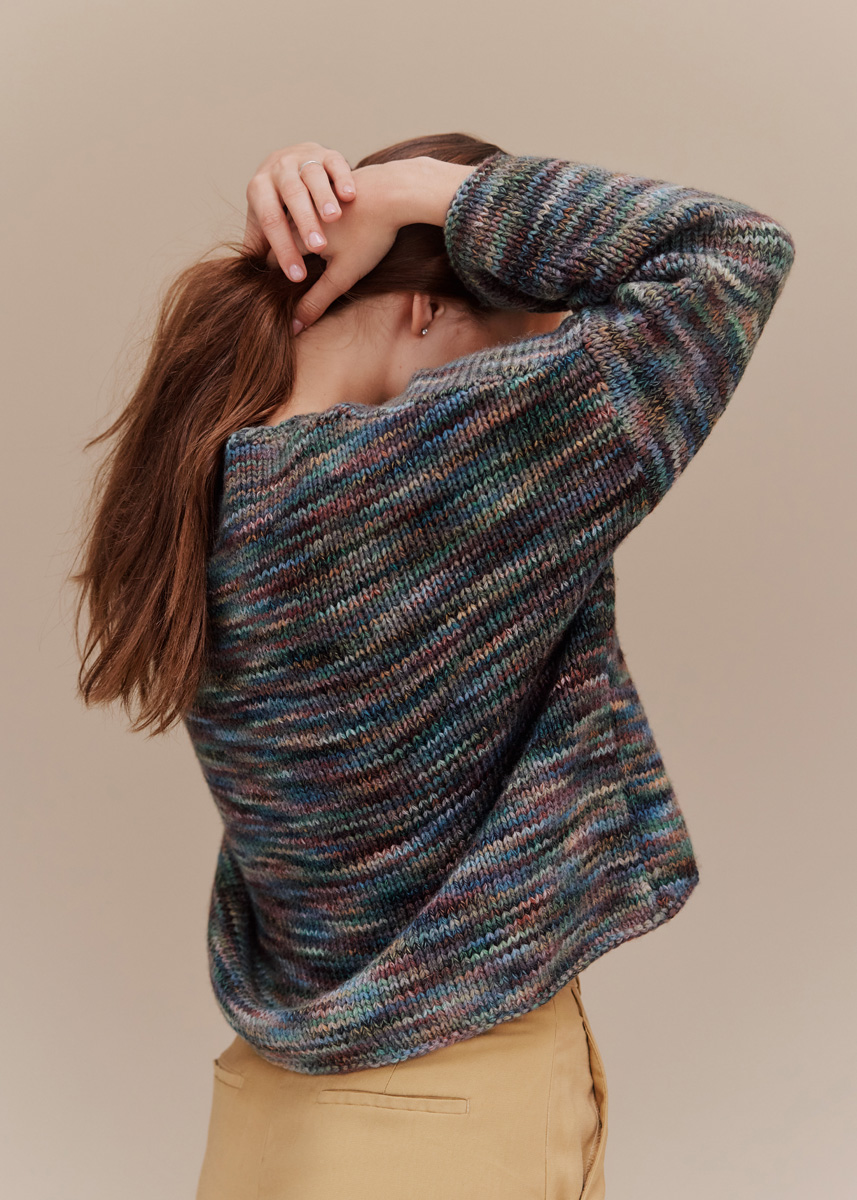 Lana Grossa-kvalitet ”Cool Merino Big Color” (90 % ren ny uld (merino), 10 % polyamid, løbelængde = ca. 90 m / 50 gr): ca. 450 (500 - 550 – 600 – 650) gr grå/gul/ oliven/turkis/ grøn/mørkegrøn/okker (fv 412), strikkepinde nr. 6 og 7, en kort rundpind nr. 6, en snoningspind.