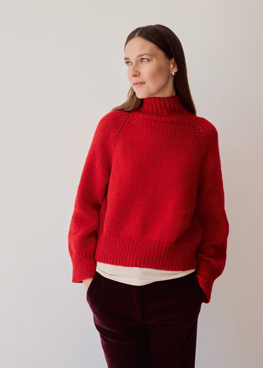 Lana Grossa Cool merino Big (90% ren ny ull (merino), 10% polyamid, löplängd 90 m/50 g), 500 (550 – 600) g röd (färg 235); 1 rundsticka nr. 6, 60 cm lång, rundstickor nr. 8, 40, 60 och 80 cm lång, samt strumpstickor nr. 6 och 8 mask-markörer.