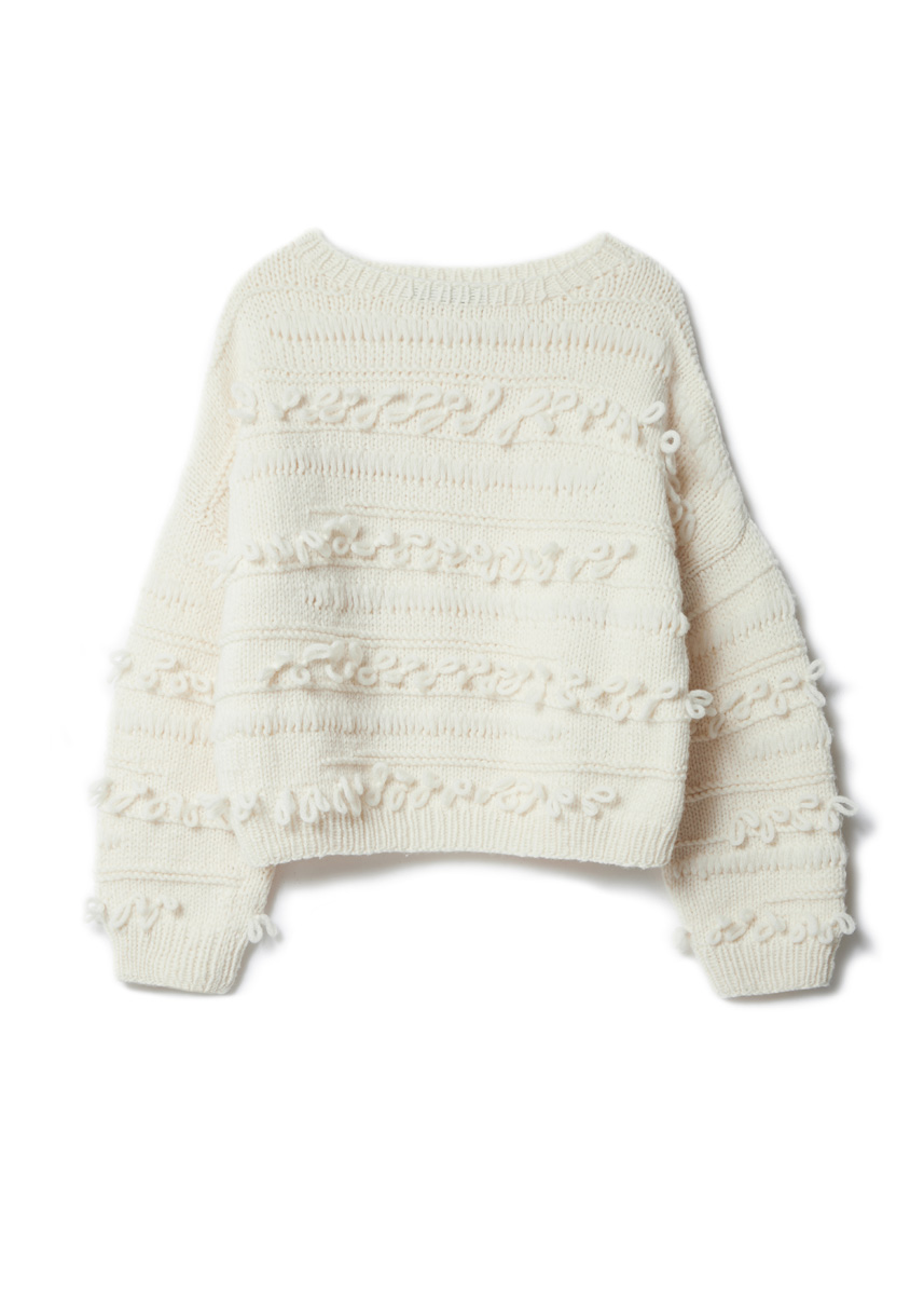 Lana Grossa „Cool Merino Big“ (90% ren ny ull (merino), 10% polyamid, löplängd = 90 m/50 g): 500 g i råvit (färg 201); stickor nr. 6 och nr. 8, 1 rundsticka nr. 6, 50 cm lång.